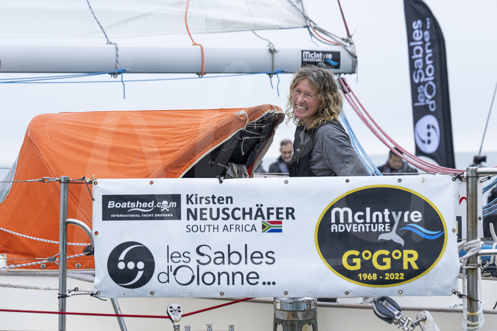 Description | LES SABLES D’OLONNE, FRANCE - APRIL 27: South African skipper Kirsten Neuschäfer wins the round the world solo sailing race without any assistance, or electronics, on April 27, 2023 in Les Sables d’Olonne, France. (Photo by Olivier Blanchet/ALeA) |