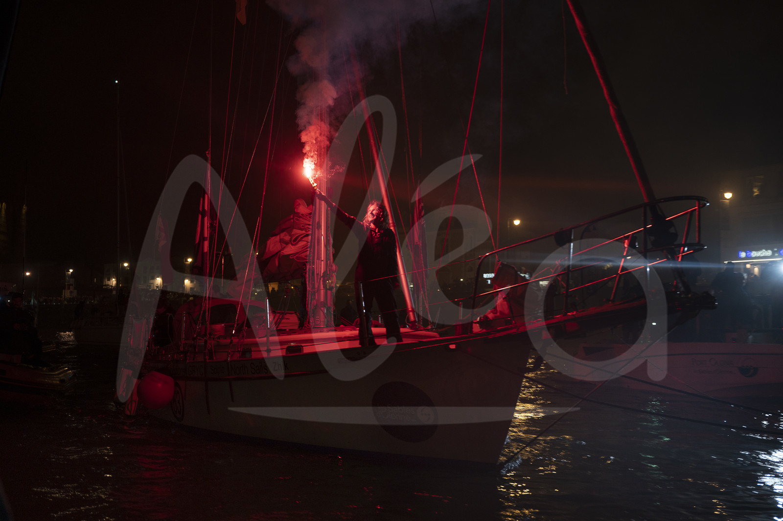 Description | LES SABLES D’OLONNE, FRANCE - APRIL 27: South African skipper Kirsten Neuschäfer celebrates with flares winning the round the world solo sailing race without any assistance, or electronics, on April 27, 2023 in Les Sables d’Olonne, France. (Photo by Olivier Blanchet/ALeA) |