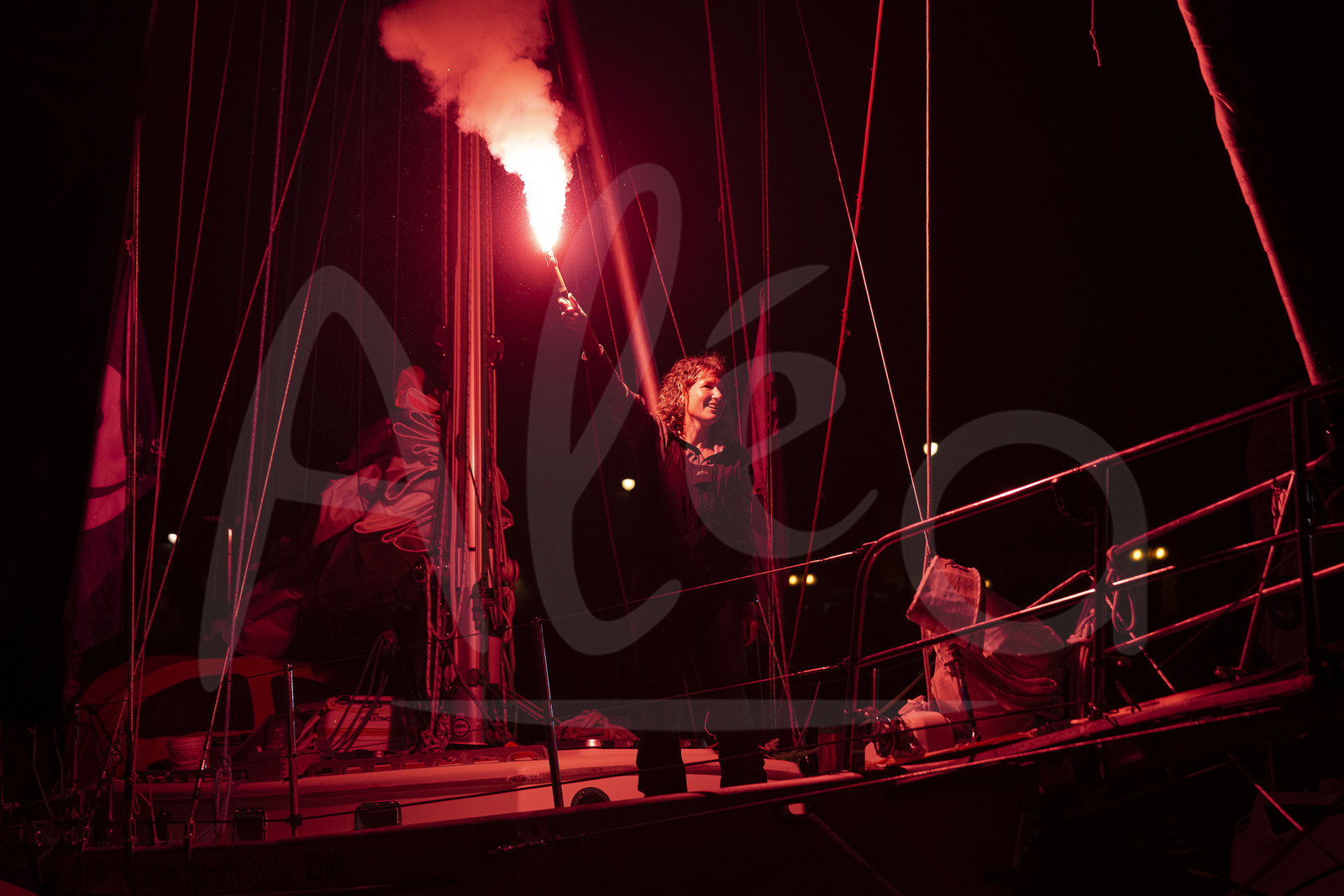 Description | LES SABLES D’OLONNE, FRANCE - APRIL 27: South African skipper Kirsten Neuschäfer celebrates with flares winning the round the world solo sailing race without any assistance, or electronics, on April 27, 2023 in Les Sables d’Olonne, France. (Photo by Olivier Blanchet/ALeA) |