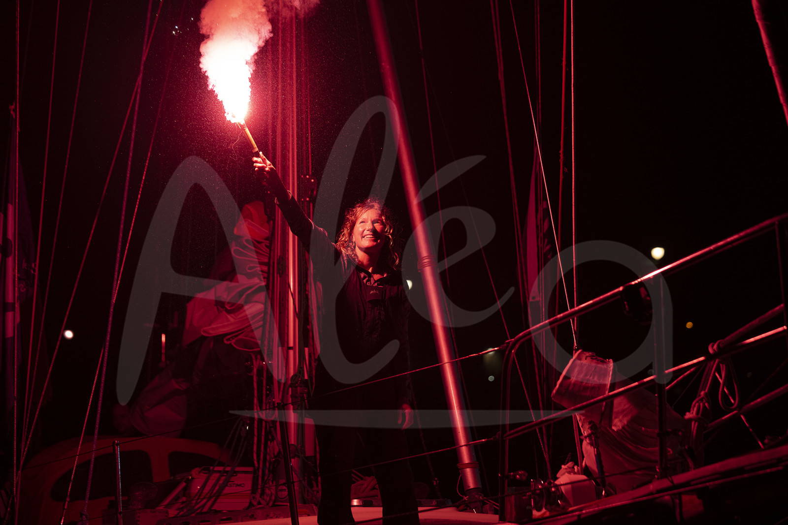 Description | LES SABLES D’OLONNE, FRANCE - APRIL 27: South African skipper Kirsten Neuschäfer celebrates with flares winning the round the world solo sailing race without any assistance, or electronics, on April 27, 2023 in Les Sables d’Olonne, France. (Photo by Olivier Blanchet/ALeA) |