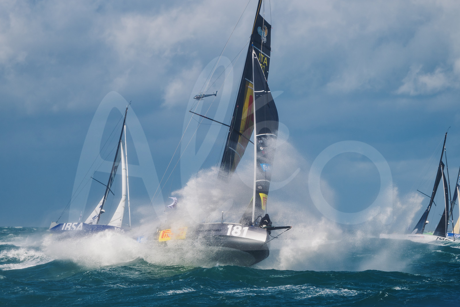 Description | LE HAVRE, FRANCE - OCTOBER 29 : Class 40 Alla Grande Pirelli, skippers Ambrogio Beccaria and Nicolas Andrieu, takes the start of the Transat Jacques Vabre in Le Havre, France, on October 29, 2023. (photo by Jean-Louis Carli / Alea) |