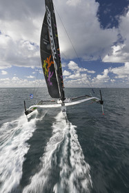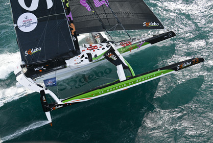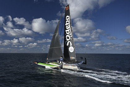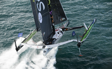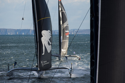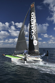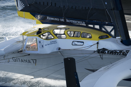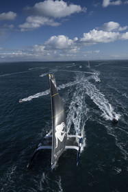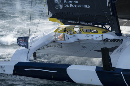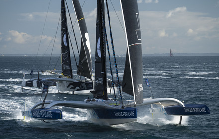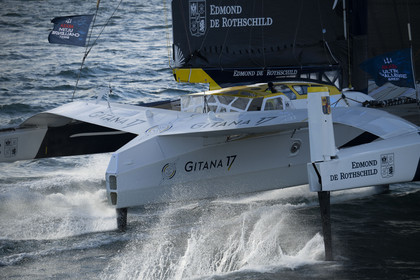 Boats are : Maxi Edmond de Rothschild, skipper Charles Caudrelier - Banque Populaire XI, skipper Armel Le Cleac'h - SVR Lazartigue, skipper Tom Laperche - Sodebo Ultim 3, skipper Thomas Coville - Actual Ultim 3, skipper Anthony Marchand - Adagio, skippe Eric Peron.