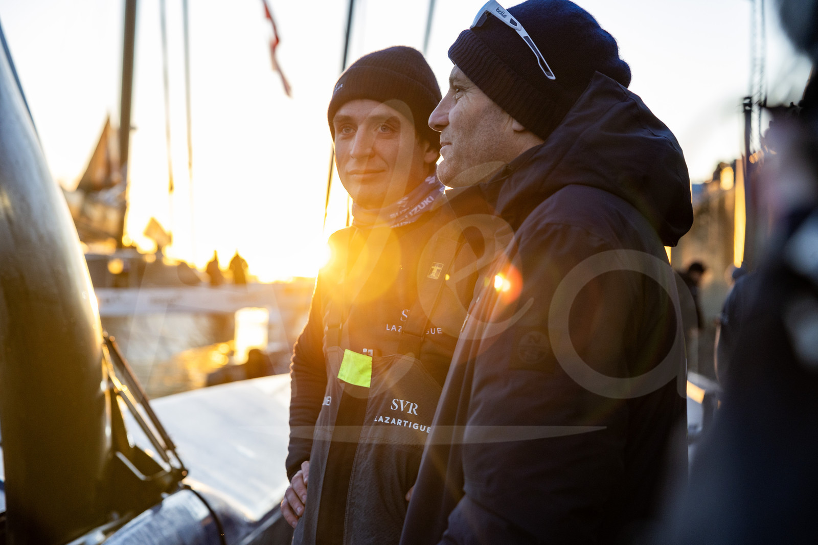 Description | BREST, FRANCE - JANUARY 07 : SVR-Lazartigue skipper Tom Laperche is portraited with Maxi Edmond de Rothschild skipper Charles Caudrelier during start of the Arkea Ultim Challenge sailing race in Brest, France, on January 07, 2024. (photo by Jean-Marie Liot / Alea) |