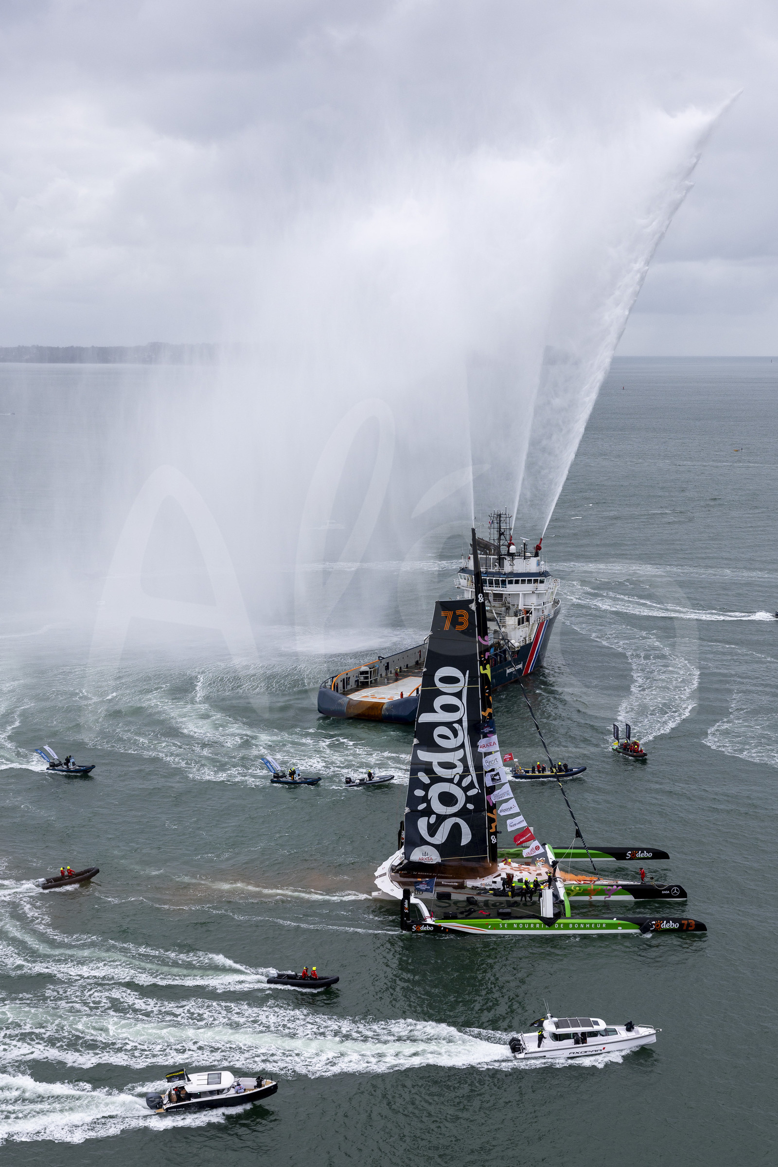 Description | Thomas Coville, skipper de Sodebo Ultim, 2e de l’Arkea Ultim Challenge, Course autour du Monde en Solitaire, en 53 jours 1 heure 12 minutes et 40 secondes, à Brest le 29/02/2024, photo © Jean-Marie LIOT / Alea #### Thomas Coville, skipper of Sodebo Ultim, finishing second of the Arkea Ultim Challenge, Non stop Ultim solo handed race around the World, in second position in 53 days, 1 hour, 12 minutes et 40 secondes, off Brest on 2024, February 29, photo © Jean-Marie LIOT / Alea |
