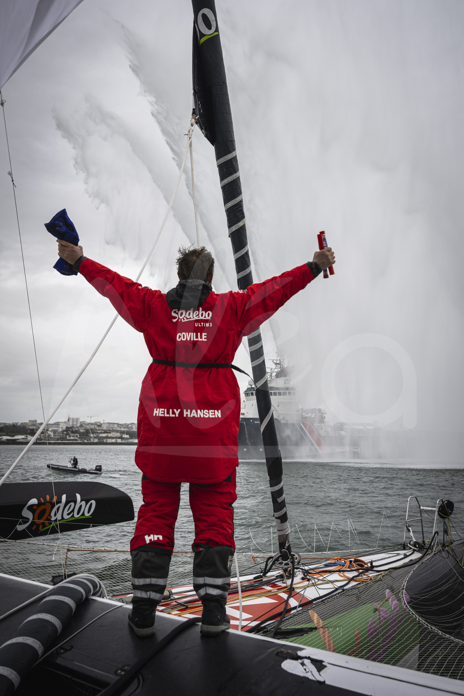 Description | BREST, FRANCE - JANUARY 29: French skipper Thomas Coville on Sodebo Ultim 3 is pictured taking second place of the Arkea Ultim Challenge Brest, on January 29, 2024 in Brest, France. (Photo by Vincent Curutchet/ALeA) |