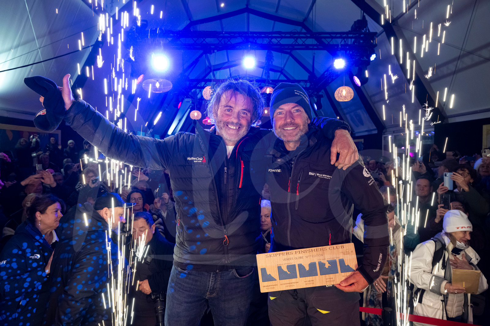 Description | LES SABLES D'OLONNE, FRANCE - FEBRUARY 02, 2025 : Fortinet - Best Western skipper Romain Attanasio (FRA) and Maître CoQ V skipper Yannick Bestaven (FRA) are photographed at the Skippers Finishers Club of the Vendee Globe, on February 02, 2025 in Les Sables d'Olonne, France - (Photo by Olivier Blanchet / Alea) |