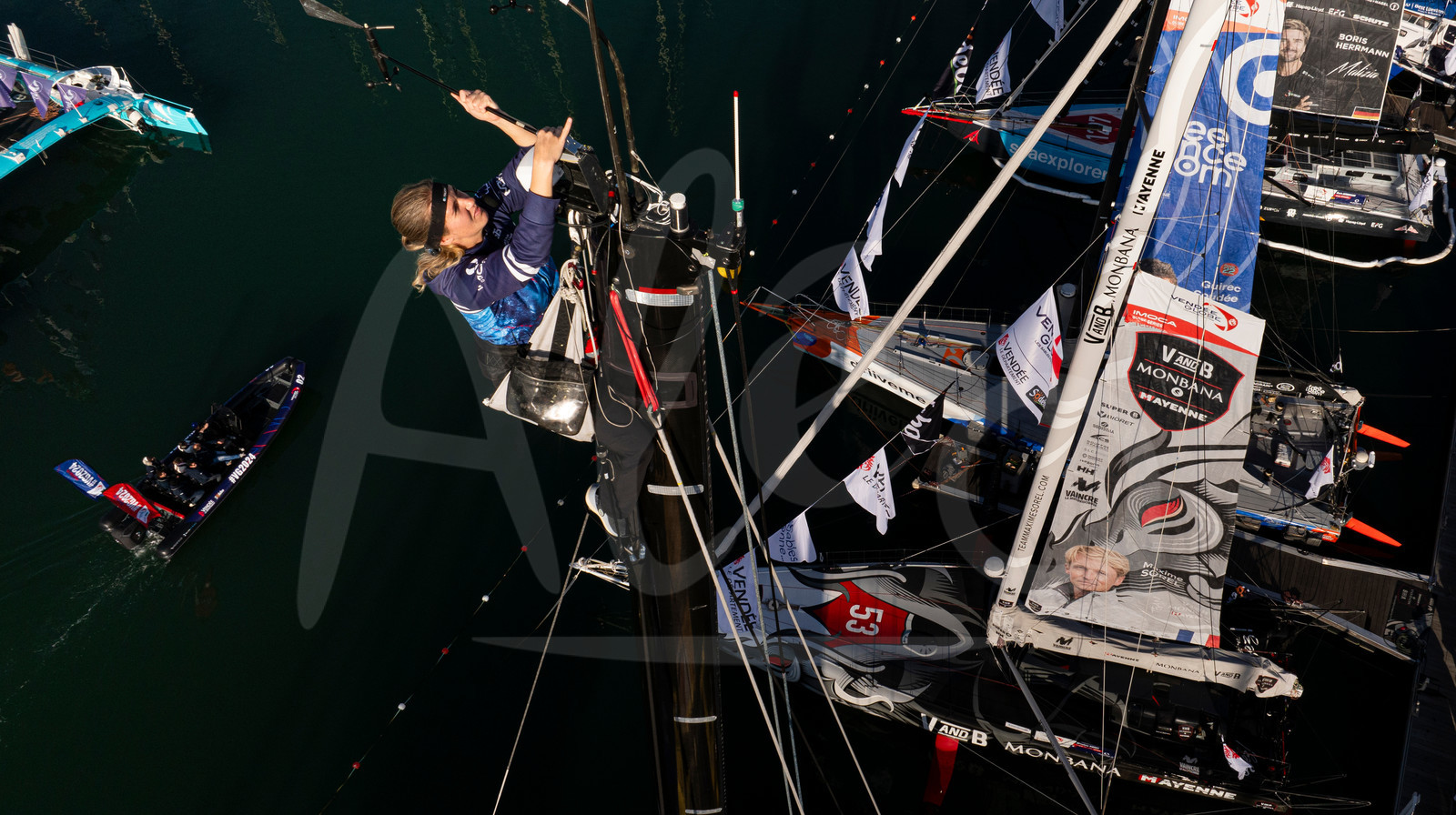 Description | LES SABLES D'OLONNE, FRANCE - NOVEMBER 3, 2024: Irina Gracheva, New Europe team member is climbing up the mast at pontoon during prestart of the Vendee Globe, on 3 November, 2024 in Les Sables d'Olonne, France. (Photo by Lloyd images / Alea) |