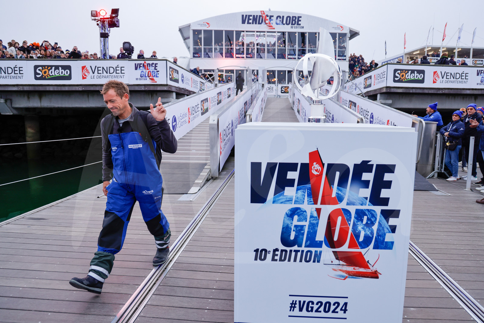 Description | LES SABLES D'OLONNE, FRANCE - NOVEMBER 10, 2024: VULNERABLE skipper Thomas Ruyant (FRA) is photographed with trophy at pontoons before start of the Vendee Globe, on November 10, 2024 in Les Sables d'Olonne, France - (Photo by Anne Beaugé / Alea) |