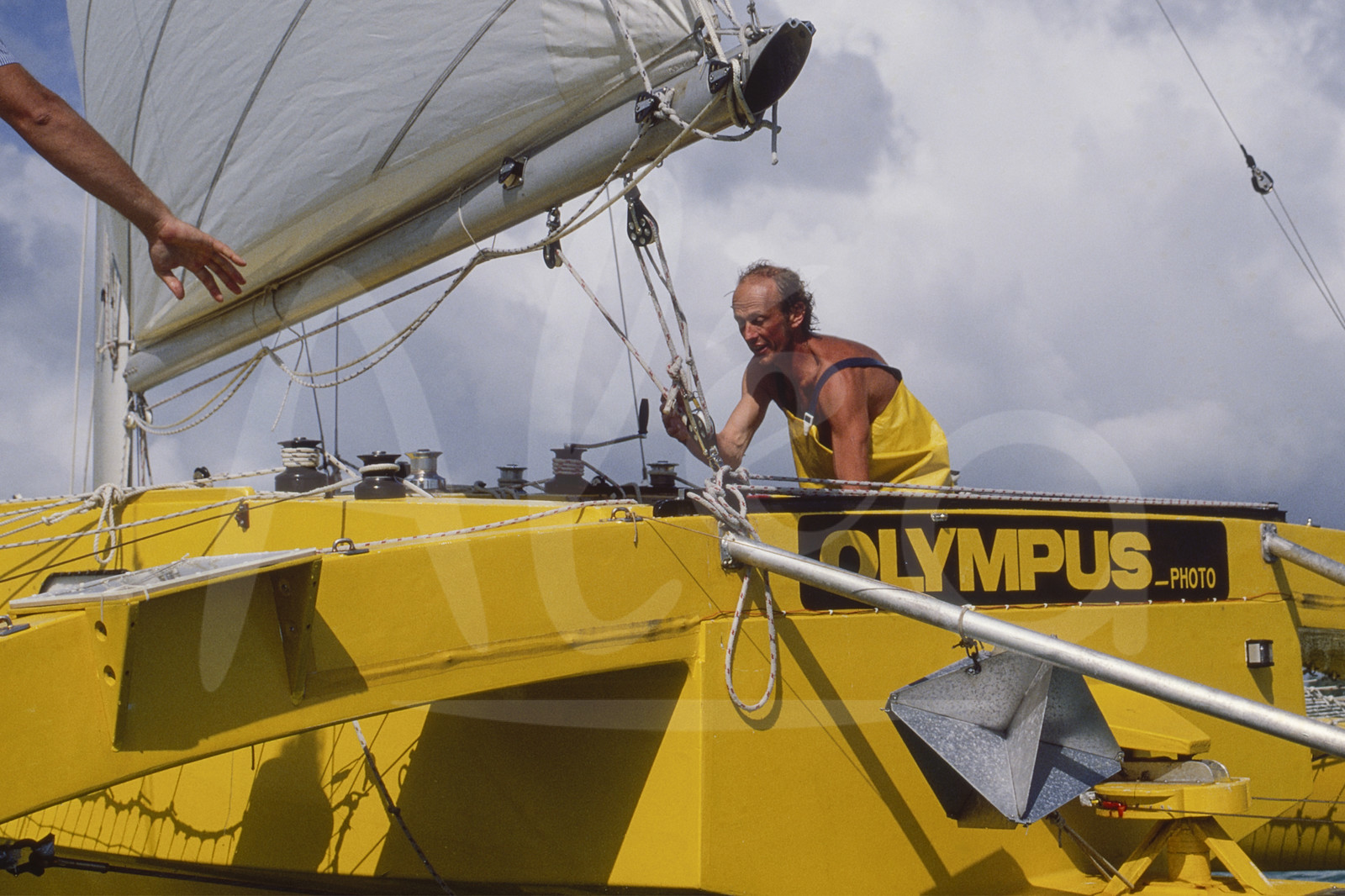 Description | Skipper Mike Birch, Olympus Photo, à l'entrainement en amont du départ de la Route du Rhum, à Saint-Malo, Bretagne, en Septembre 1978 - Photo Bernard Rubinstein / ALEA |