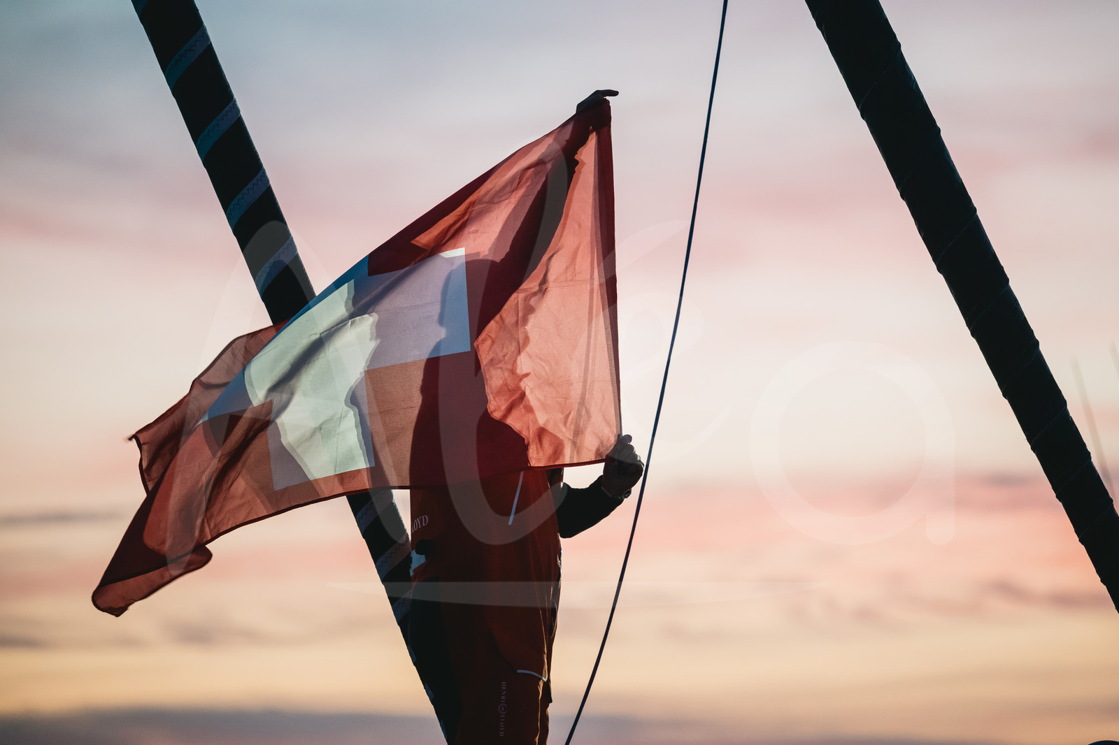 Description | LES SABLES D’OLONNE, FRANCE - FEBRUARY 17, 2025 : Tut Gut. Sailing skipper Oliver Heer (SUI) is celebrating with a Swiss flag taking 29th place in the Vendee Globe, on February 17, 2025 in Les Sables d'Olonne, France - (Photo by Jean-Louis Carli / Alea) |