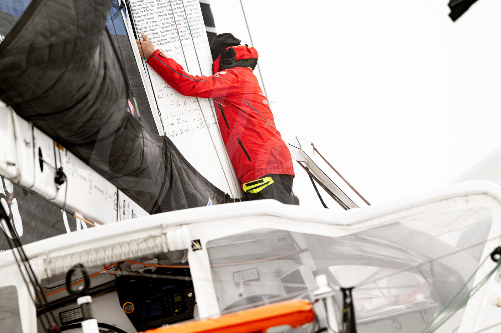 | Description | LES SABLES D’OLONNE, FRANCE - FEBRUARY 02, 2025 : Fortinet - Best Western skipper Romain Attanasio (FRA) is thanking his mast after taking 14th place in the Vendee Globe, on February 02, 2025 in Les Sables d'Olonne, France - (Photo by Olivier Blanchet / Alea) |