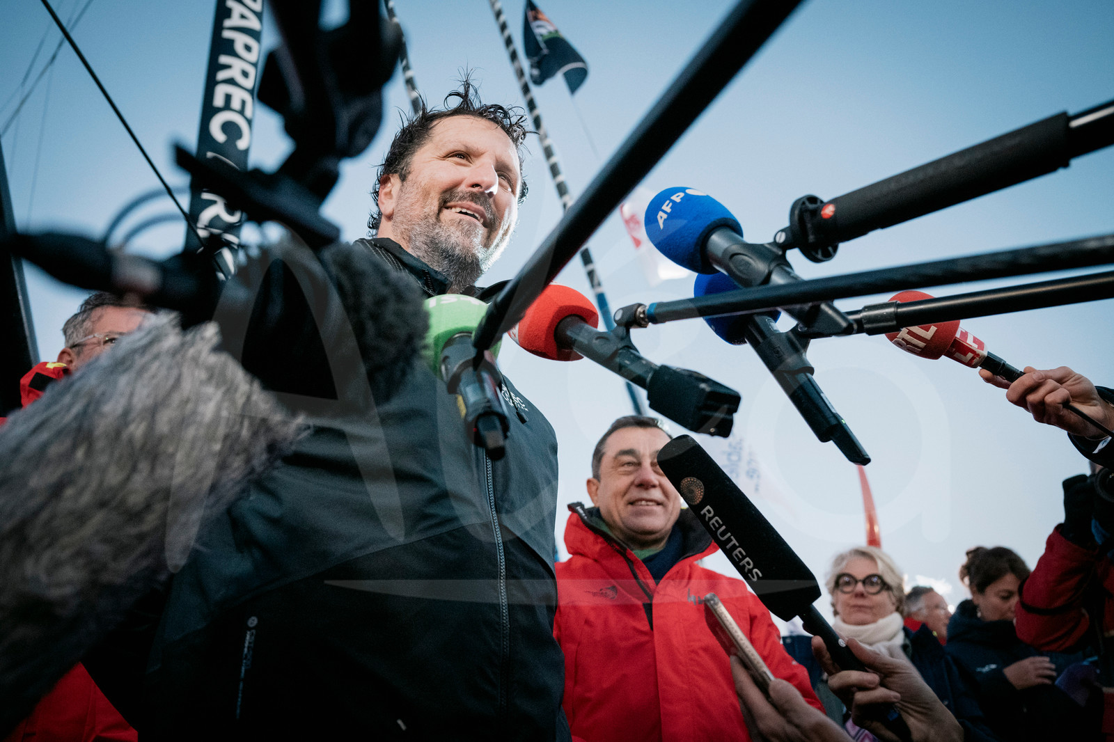| Description | LES SABLES D'OLONNE, FRANCE - JANUARY 15, 2025 : PAPREC ARKÉA skipper Yoann Richomme (FRA) is photographed being interviewed by media after taking 2nd place in the Vendee Globe, on January 15, 2025 in Les Sables d'Olonne, France - (Photo by Vincent Curutchet / Alea) |