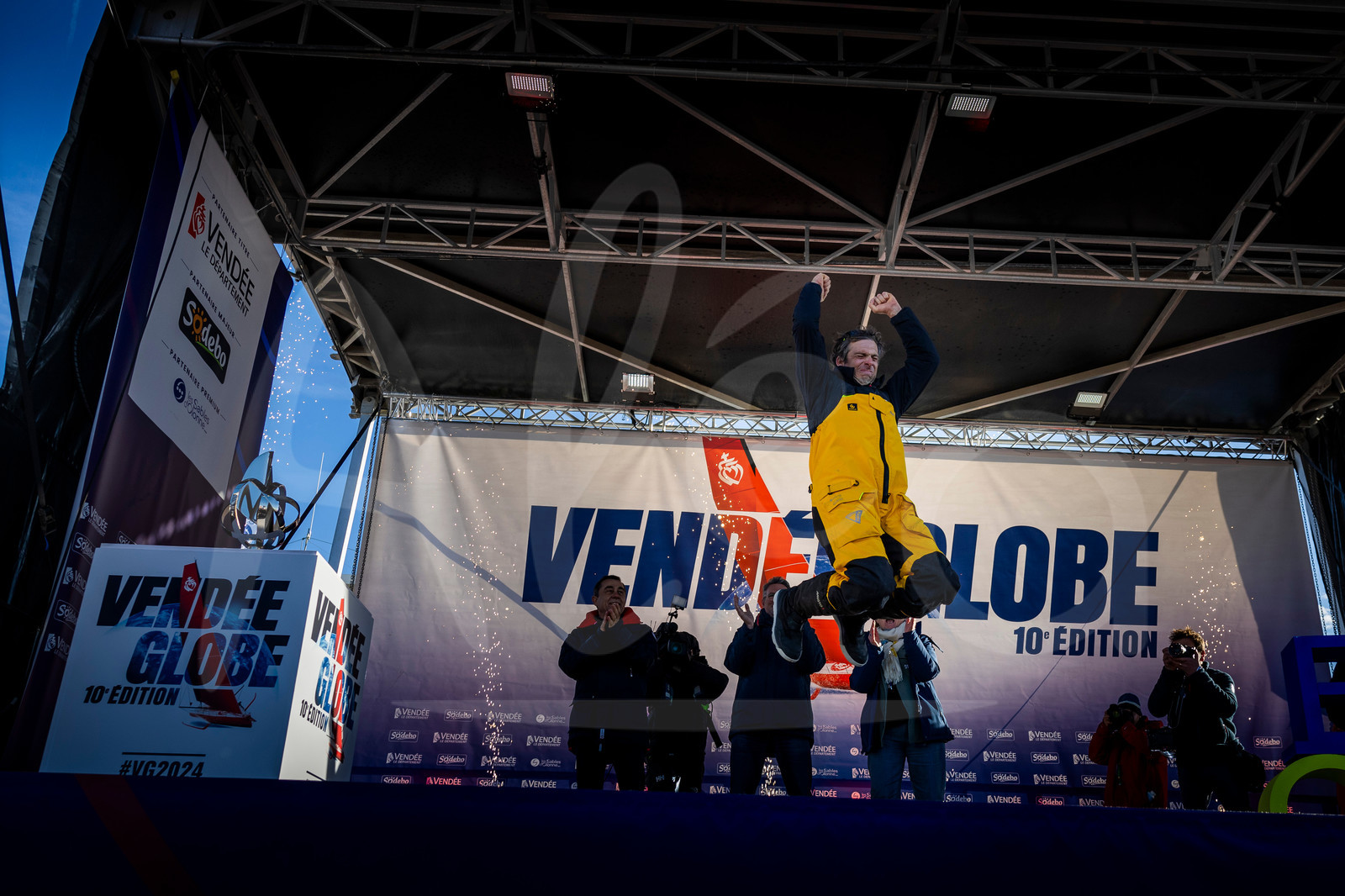 | Description | LES SABLES D'OLONNE, FRANCE - JANUARY 14, 2025 : MACIF Santé Prévoyance skipper Charlie Dalin (FRA) is photographed celebrating on stage after winning the Vendee Globe, on January 14, 2025 in Les Sables d'Olonne, France - (Photo by Jean-Marie Liot / Alea) |