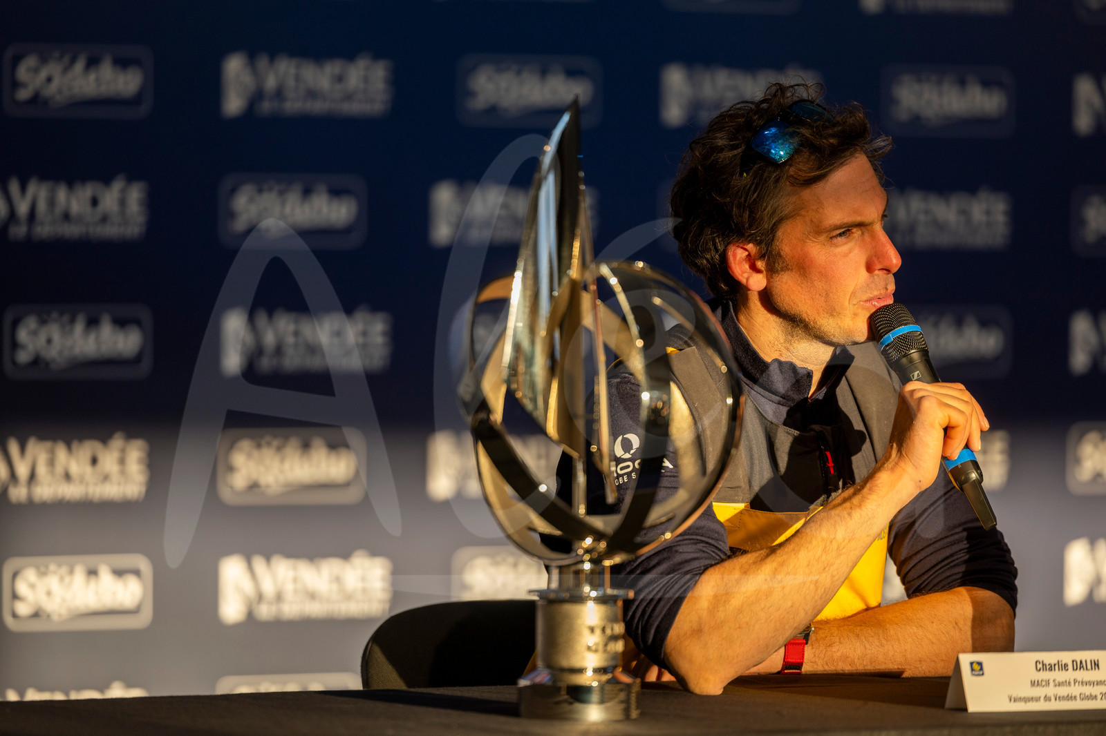Description | LES SABLES D'OLONNE, FRANCE - JANUARY 14, 2025 : MACIF Santé Prévoyance skipper Charlie Dalin (FRA) is photographed during his press conference with his trophy after winning the Vendee Globe, on January 14, 2025 in Les Sables d'Olonne, France - (Photo by Jean-Marie Liot / Alea) |