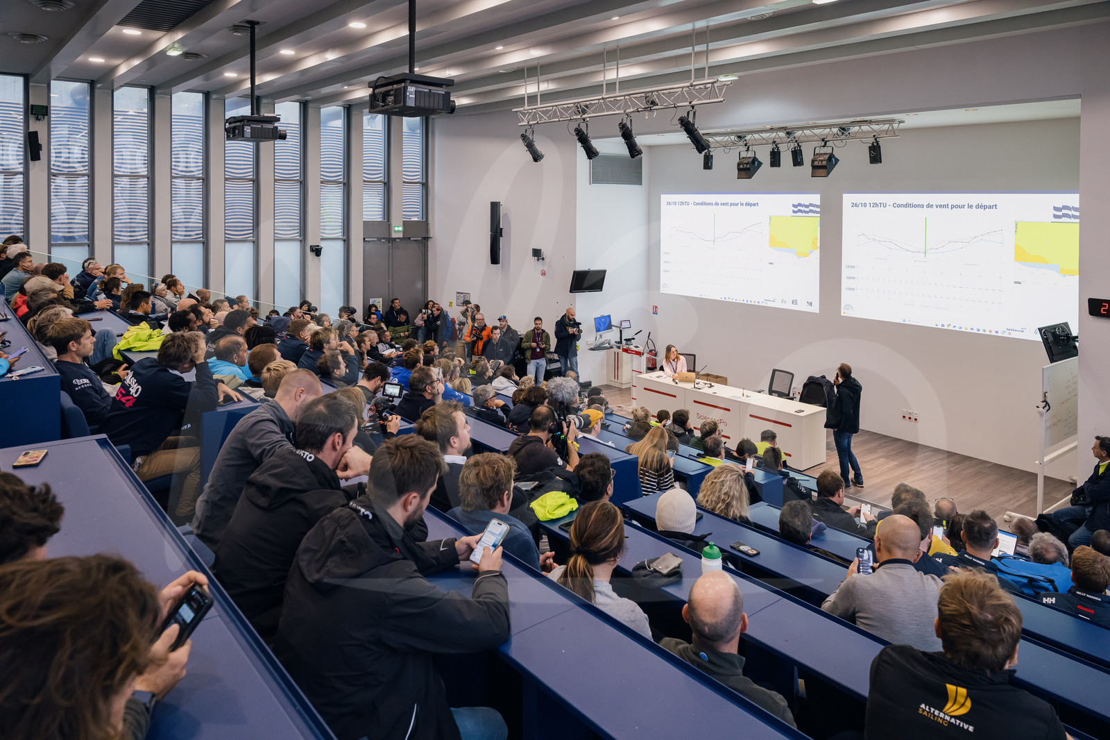 Illustation of the race start briefing at the Transat Café L’Or village in Le Havre, France, on October 25, 2025. (Photo by Jean-Louis Carli / Alea)