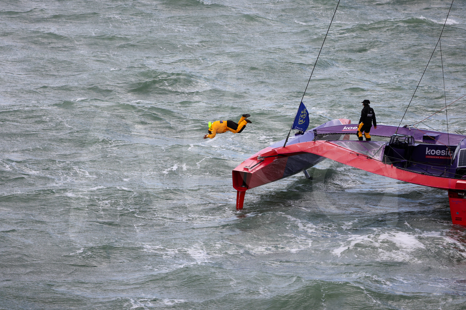 | Description | LE HAVRE, FRANCE: Ocean Fifty Koesio, skippers Erwan Le Roux and Audrey Ogereau is photographed with a crew member jumping at sea at the start of the Transat Café l'OR 2025 on October 25, 2025 in Le Havre, France. (Photo by Jean-Marie Liot / Alea) |
