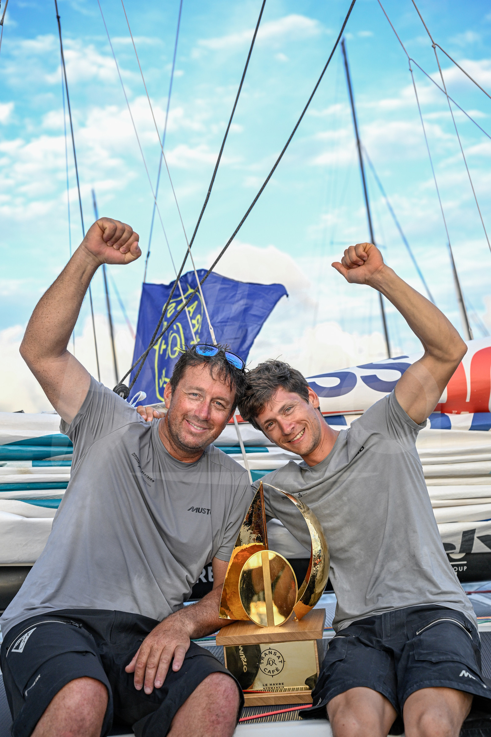 | Description | FORT-DE-FRANCE, MARTINIQUE : Class 40 Seafrigo - Sogestran, skippers Guillaume Pirouelle and Cédric Chateau, celebrate with the trophy winning their category of the Transat Café l'OR 2025 on November 17, 2025 in Fort-de-France, Martinique. (Photo by Jean-Louis Carli / Alea) |
