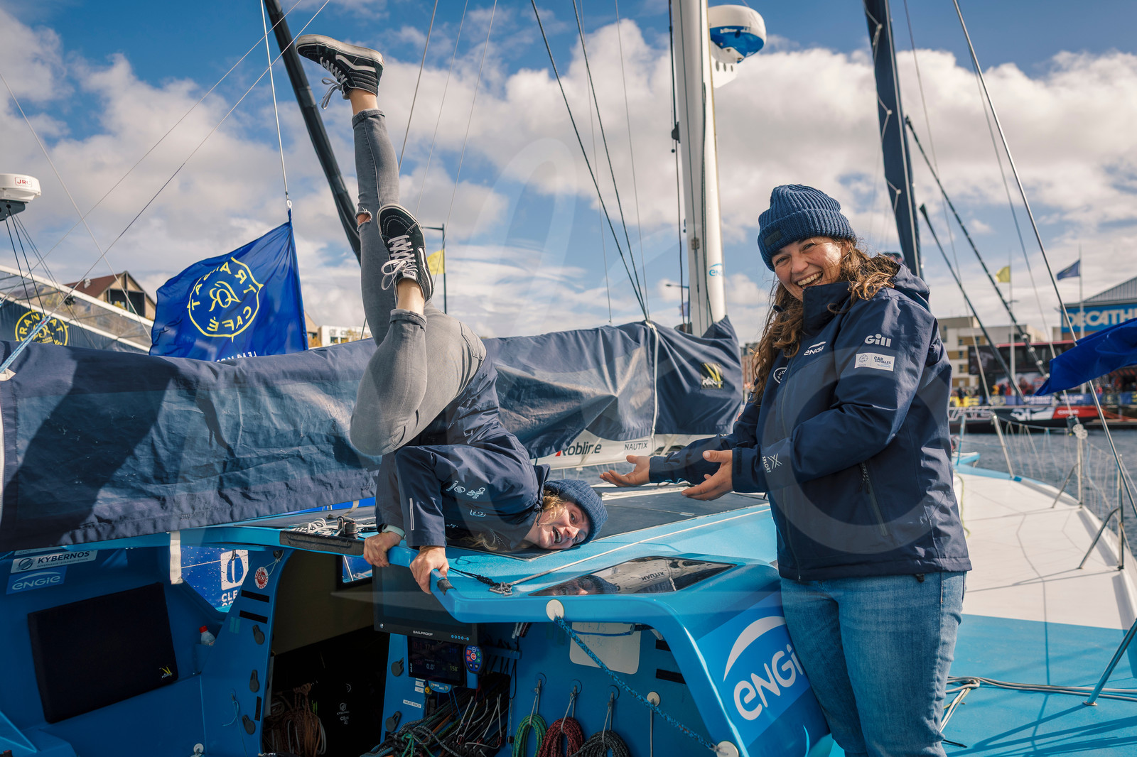 | Description | Class 40 Engie - Dessine moi la High-Tech, skippers Aina Bauza Roig and Axelle Pillain, are photographed for a social post at the Transat Café L’Or Village in Le Havre, France, on October 20, 2025. (Photo by Jean-Marie Liot / Alea) |