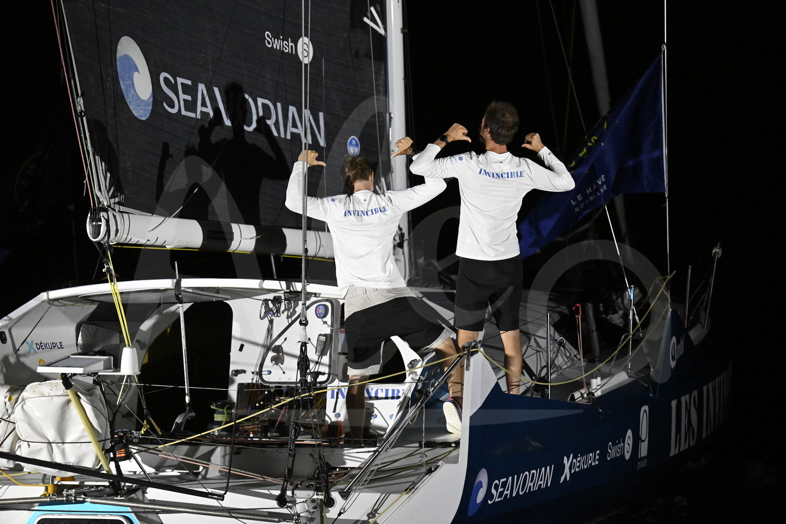 | Description | FORT-DE-FRANCE, MARTINIQUE : Class 40 Les Invincibles, skippers William Mathelin-Moreaux and Pietro Luciani, celebrate arriving third in their category of the Transat Café l'OR 2025 on November 17, 2025 in Fort-de-France, Martinique. (Photo by Jean-Louis Carli / Alea) |
