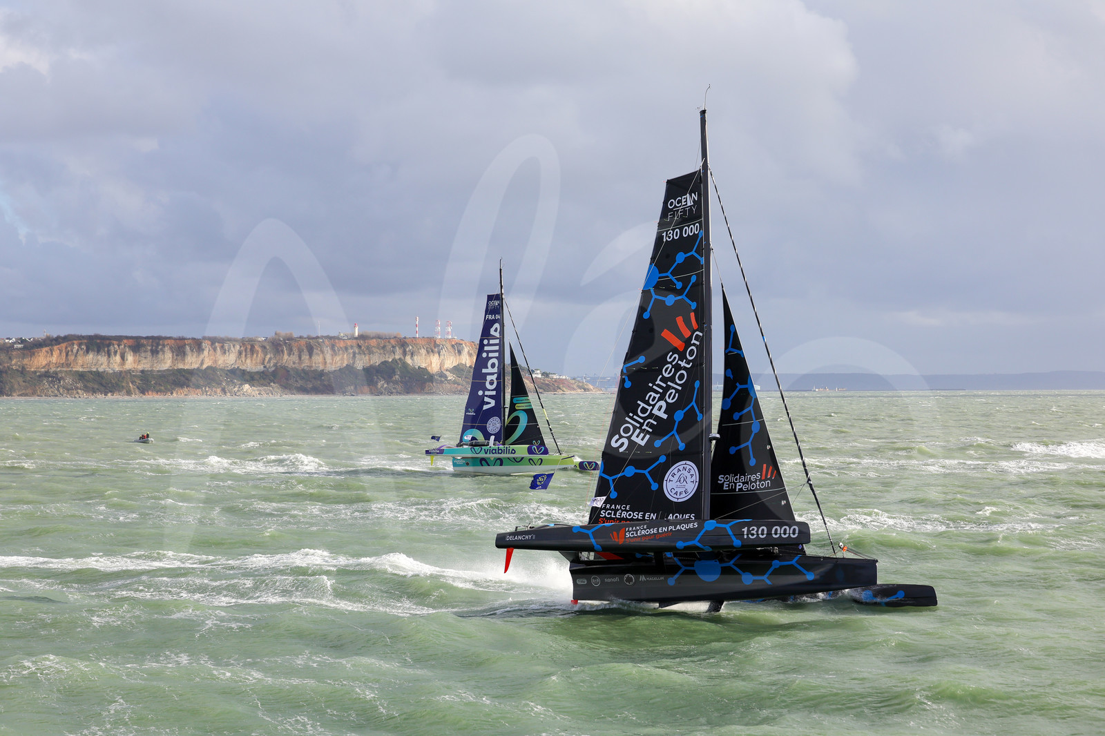 | Description | LE HAVRE, FRANCE: Ocean Fifty Solidaires En Peloton and Viabilis Océans are photographed at the start of the Transat Café l'OR 2025 on October 25, 2025 in Le Havre, France. (Photo by Jean-Marie Liot / Alea) |