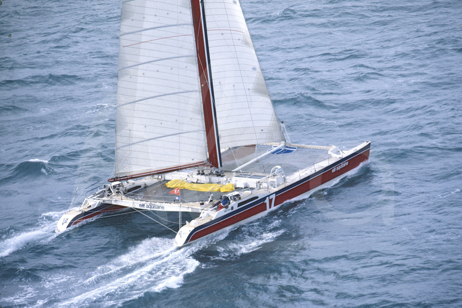 Description | Skipper Marc Pajot, catamaran Elf Aquitaine, pendant le départ de la Route du Rhum, à Saint-Malo, Bretagne, le 7 Novembre 1982 - Photo Bernard Rubinstein / ALEA |