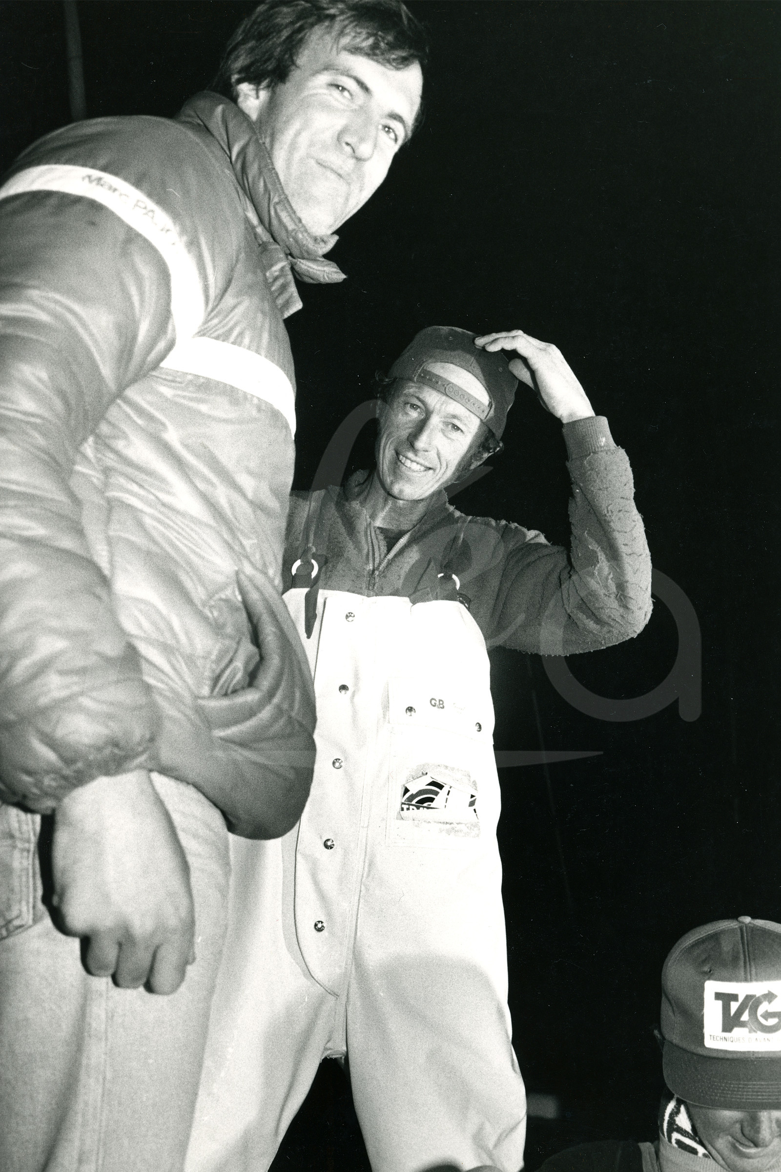 Description | Skippers Marc Pajot, Elf Aquitaine, et Mike Birch, Vital, avant le départ de la Route du Rhum, à Saint-Malo, Bretagne, le 7 Novembre 1982 - Photo Bernard Rubinstein / ALEA |
