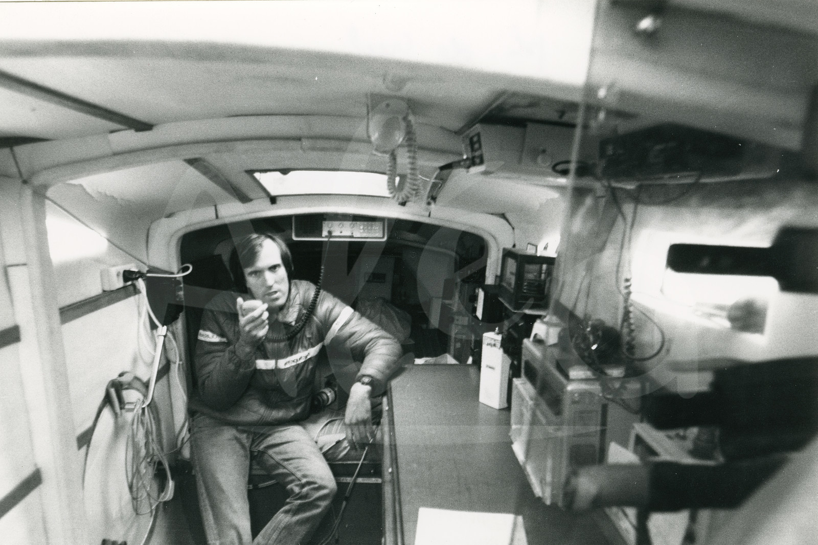 Description | Skipper Marc Pajot, Elf Aquitaine, à sa table à cartes avant le départ de la Route du Rhum, à Saint-Malo, Bretagne, le 7 Novembre 1982 - Photo Bernard Rubinstein / ALEA |