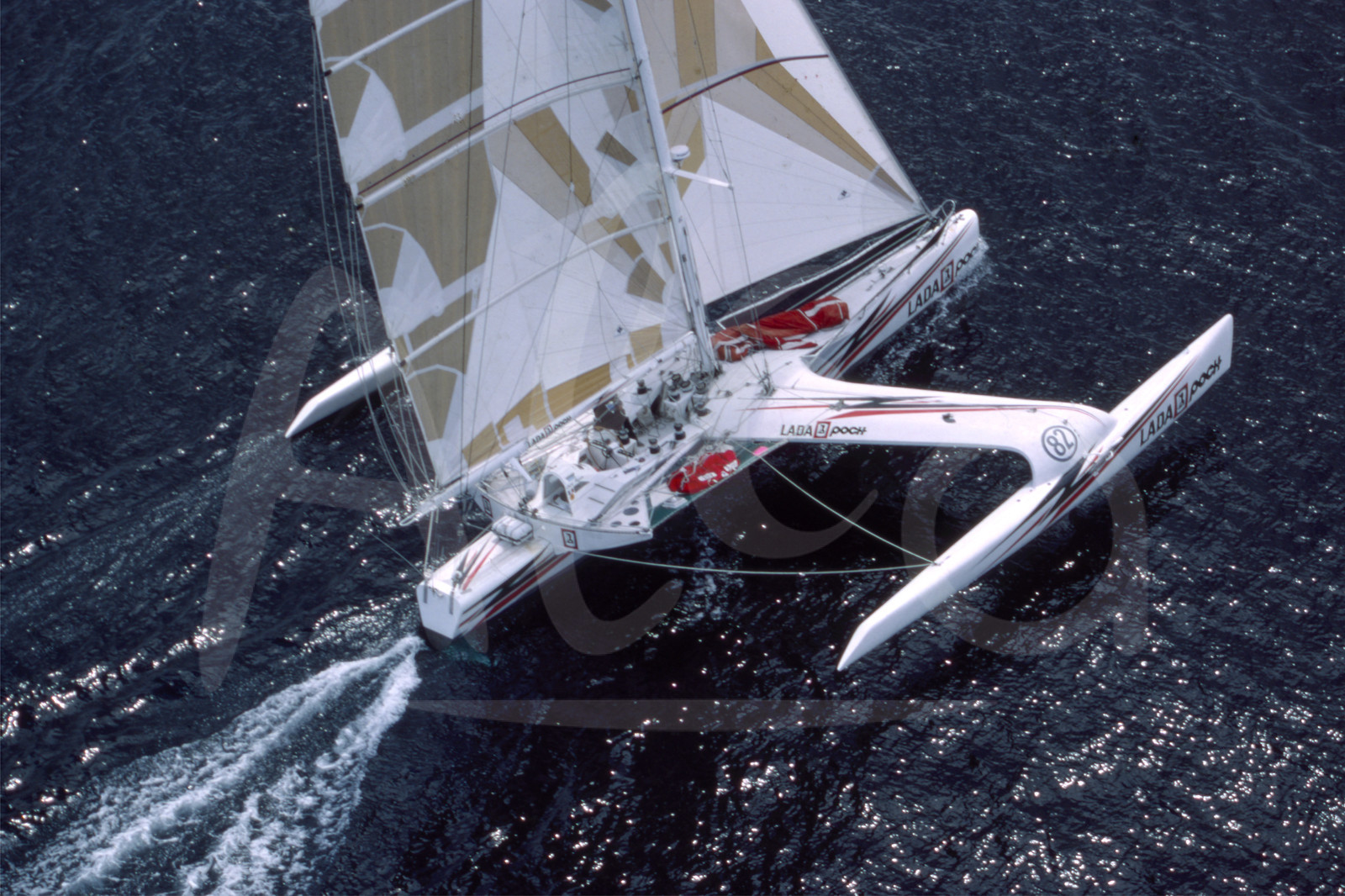 Description | Skippers Loick Peyron et Jacques Delorme, trimaran Lada Poch, pendant le départ de La Baule - Dakar en 1987 - Photo Bernard Rubinstein / ALEA |
