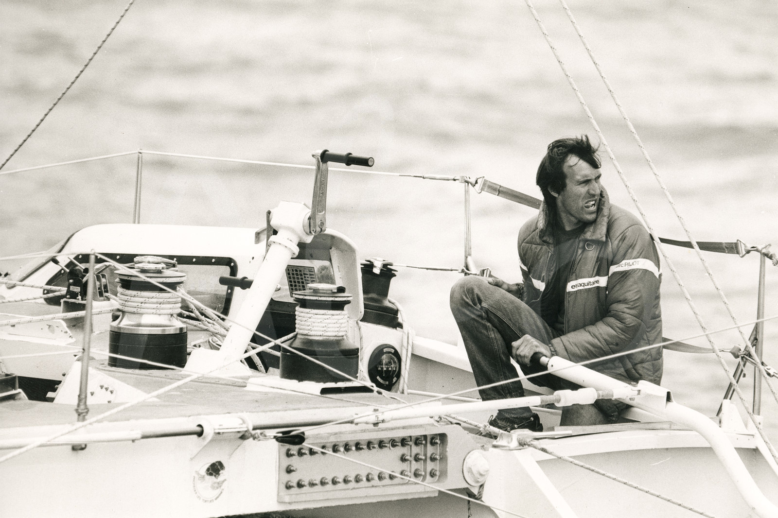 Description | Skipper Marc Pajot, Elf Aquitaine, à bord avant le départ de la Route du Rhum, à Saint-Malo, Bretagne, le 5 Novembre 1982 - Photo Bernard Rubinstein / ALEA |