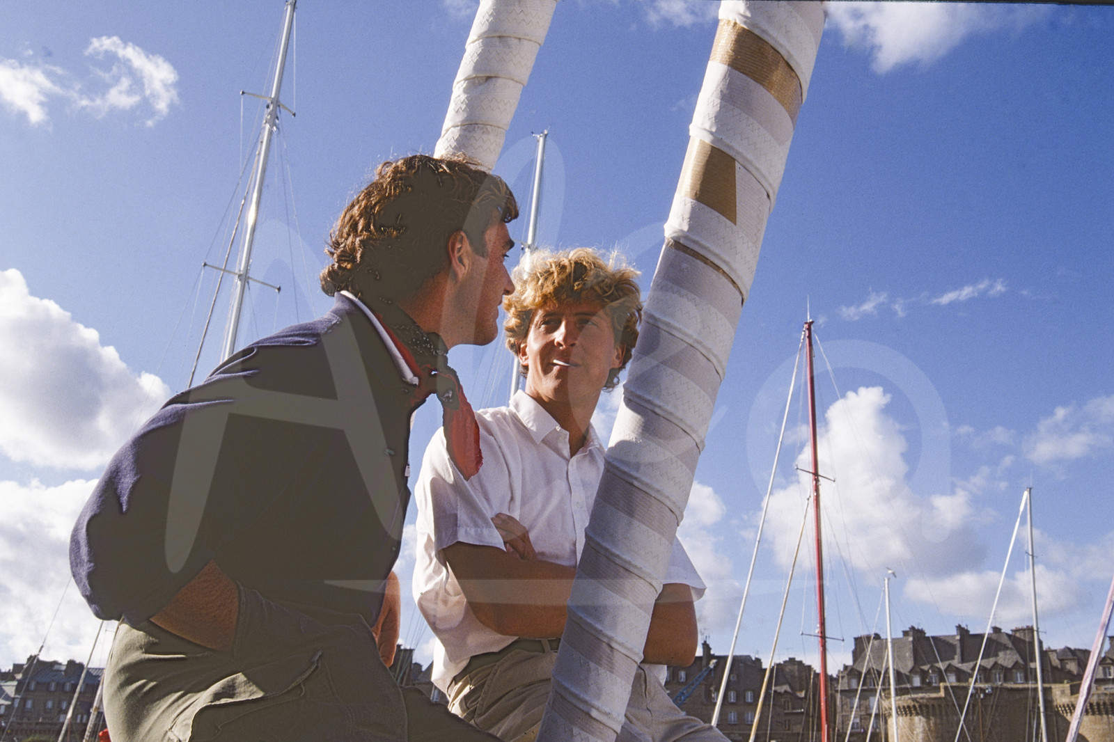 Description | Portrait Skippers Loick Peyron, Lada Poch IV, et Laurent Bourgnon, RMO, avant le départ de la Route du Rhum, à St-Malo, France, le 2 Novembre 1990 - Photo François Mousis / ALEA |
