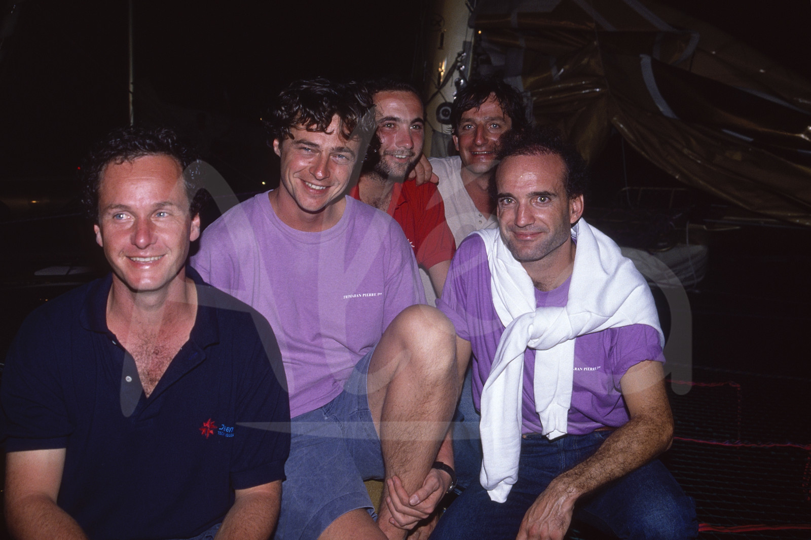 Description | Membres du team vainqueur, Skipper Florence Arthaud, trimaran Pierre 1er, à l'arrivée de la Route du Rhum, à Pointe A Pitre, Guadeloupe, le 18 Novembre 1990 - Photo Bernard Rubinstein / ALEA.JF de Premorel (constructeur), Marc Van Pethegem et Vincent Lauriot-Prevost (au fond) (architectes navals), et leur routeur météo Louis Bodin (à droite) |