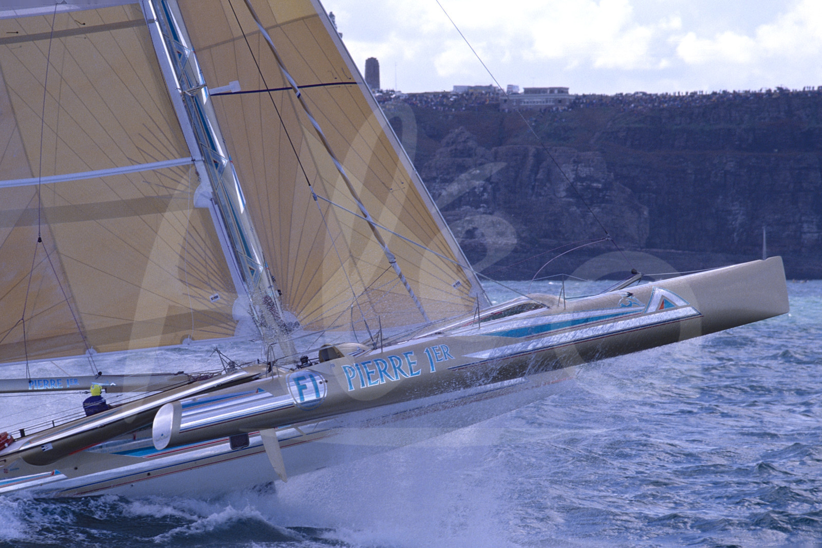 Description | Action du trimaran Pierre 1er, skipper Florence Arthaud, au large du Cap Fréhel lors du départ de la Route du Rhum, à St-Malo, France, le 4 Novembre 1990 - Photo François Mousis / ALEA |
