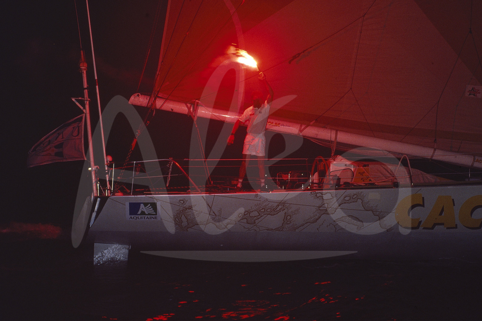 Description | Joie du 3ème, Skipper Yves Parlier, Cacolac d'Aquitaine, à l'arrivée de la Route du Rhum, à Pointe A Pitre, Guadeloupe, le 21 Novembre 1994 - Photo Bernard Rubinstein / ALEA |