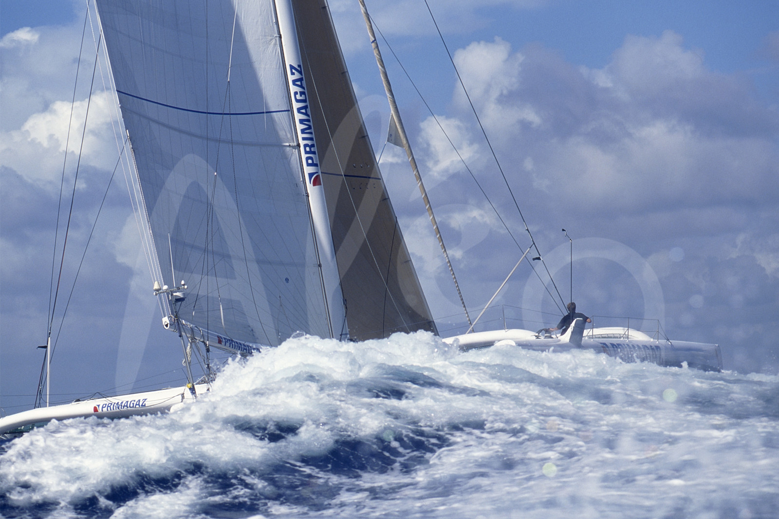 Description | Arrivée du vainqueur, Laurent Bourgnon, Primagaz, de la Route du Rhum, dans la baie de Pointe A Pitre, Antilles, le 20 Novembre 1994 - Photo François Mousis / ALEA |
