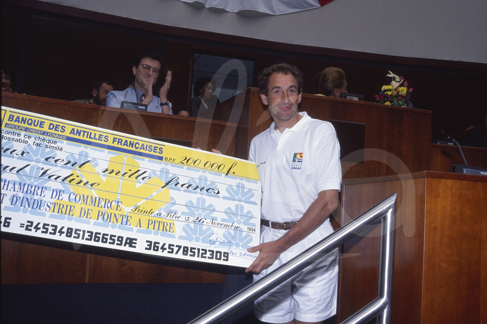 Description | Remise de prix pour le Skipper Paul Vatine, Région Haute Normandie (2ème), à l'arrivée de la Route du Rhum, à Pointe A Pitre, Guadeloupe, le 27 Novembre 1994 - Photo Bernard Rubinstein / ALEA |