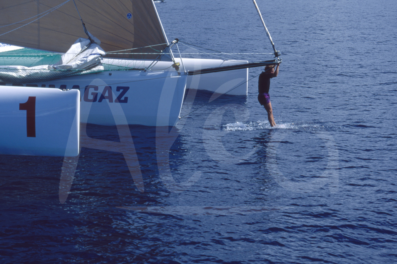 Description | Vainqueur, Skipper Laurent Bourgnon, trimaran Primagaz, faisant le pitre sur le bout dehors, à l'arrivée de la Route du Rhum, à Pointe A Pitre, Guadeloupe, le 20 Novembre 1994 - Photo Bernard Rubinstein / ALEA |
