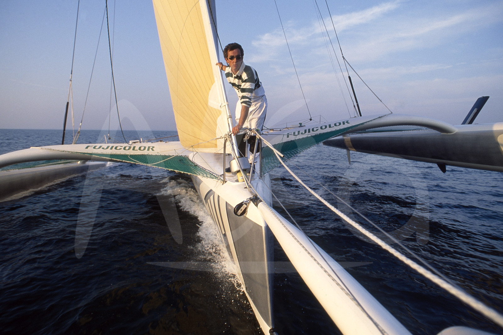 Description | Skipper Loick Peyron, Fujicolor II, à l'entrainement avant le départ de la Route du Rhum, au large de St-Malo, France, le 21 Octobre 1994 - Photo François Mousis / ALEA |
