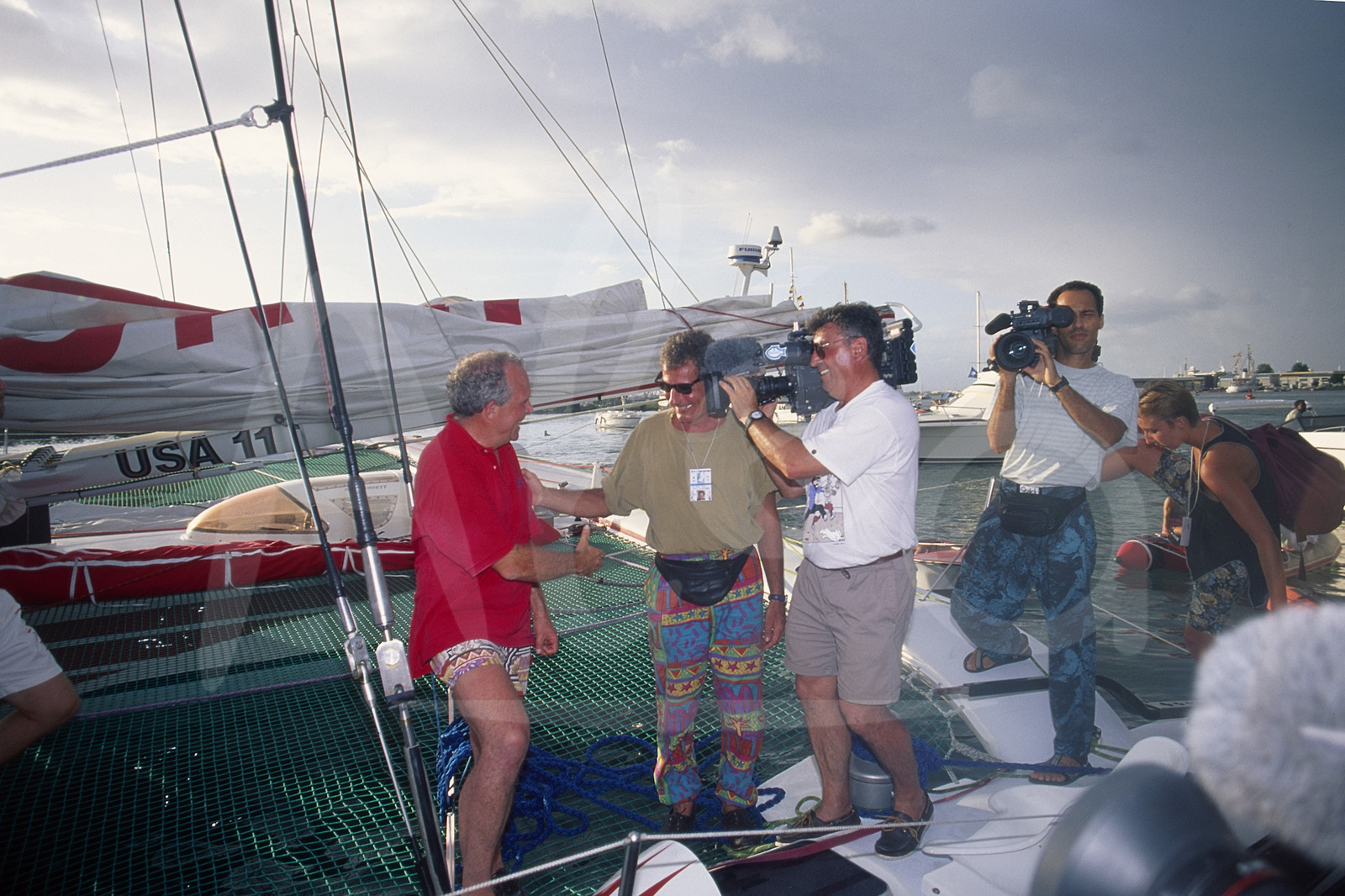 Description | Ambiance medias pour le Skipper Steve Fossett, trimaran Lakota (Ex-Pierre 1er), à l'arrivée de la Route du Rhum, à Pointe A Pitre, Guadeloupe, le 23 Novembre 1994 - Photo Bernard Rubinstein / ALEA |