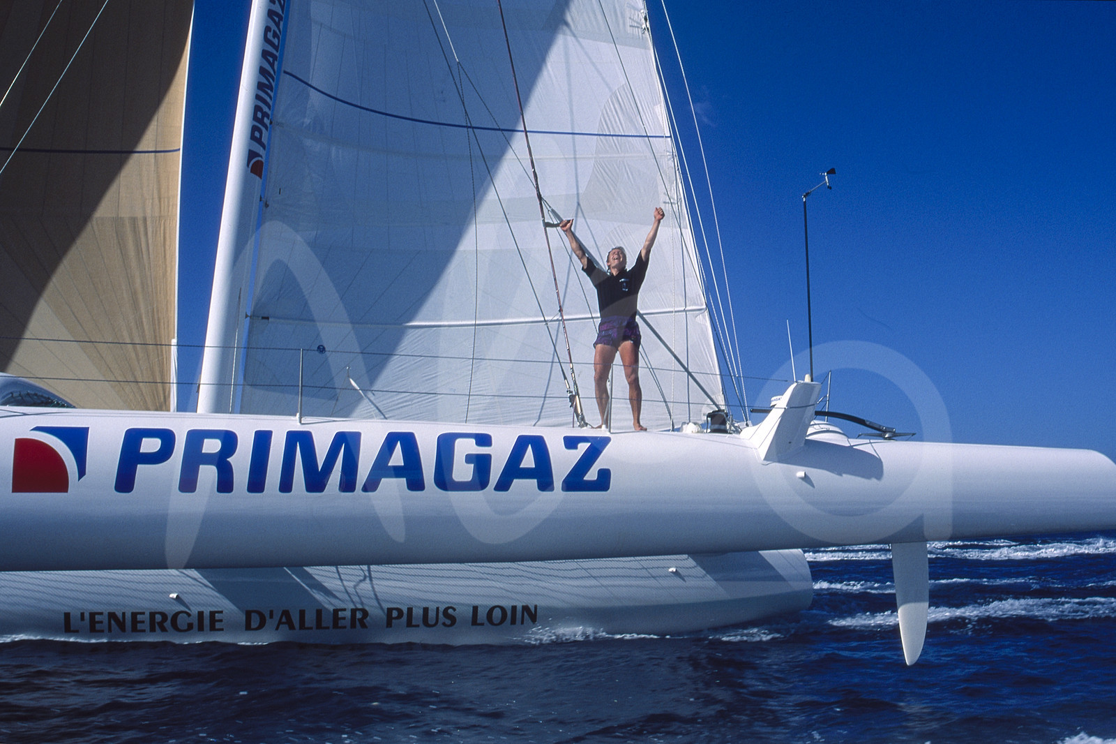 Description | Vainqueur, Skipper Laurent Bourgnon, trimaran Primagaz, à l'arrivée de la Route du Rhum, à Pointe A Pitre, Guadeloupe, le 20 Novembre 1994 - Photo Bernard Rubinstein / ALEA |