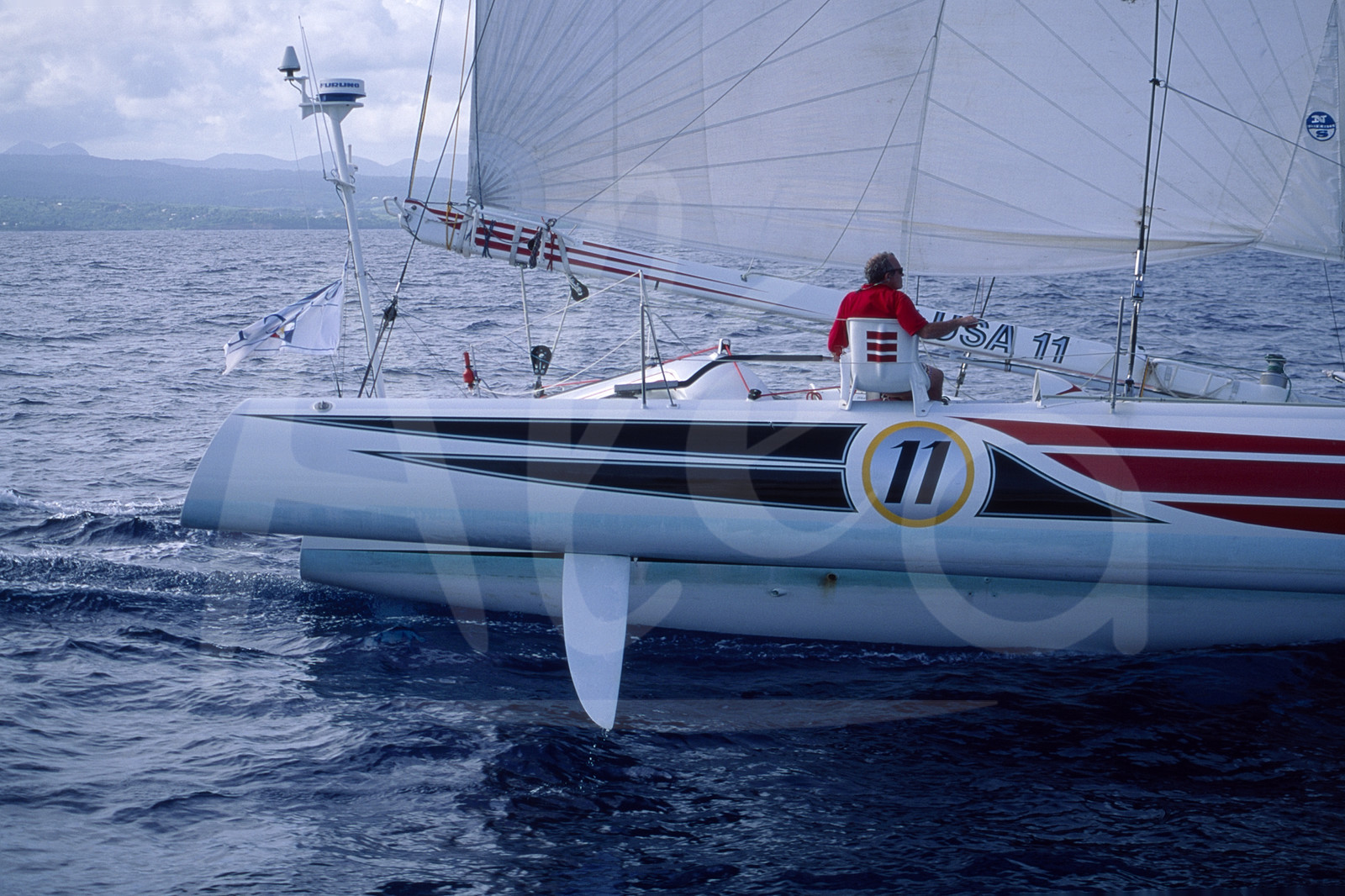 Description | Action du Skipper Steve Fossett, trimaran Lakota (Ex-Pierre 1er), à l'arrivée de la Route du Rhum, à Pointe A Pitre, Guadeloupe, le 23 Novembre 1994 - Photo Bernard Rubinstein / ALEA |