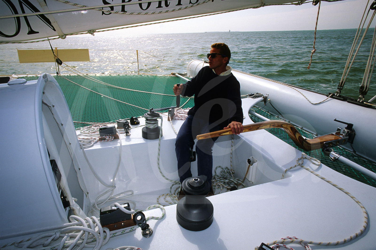 Description | SAILING - TRANSATLANTIC RACE - ROUTE DU RHUM HISTORY -SAINT-MALO (FRA) - 11/1994 PHOTO : JEAN-JACQUES BERNARD / ALEA ROUTE DU RHUM 1994 - HARRIS WILSON SPORTSWEAR / SKIPPER : JEAN MAUREL (FRA) AT THE HELM |