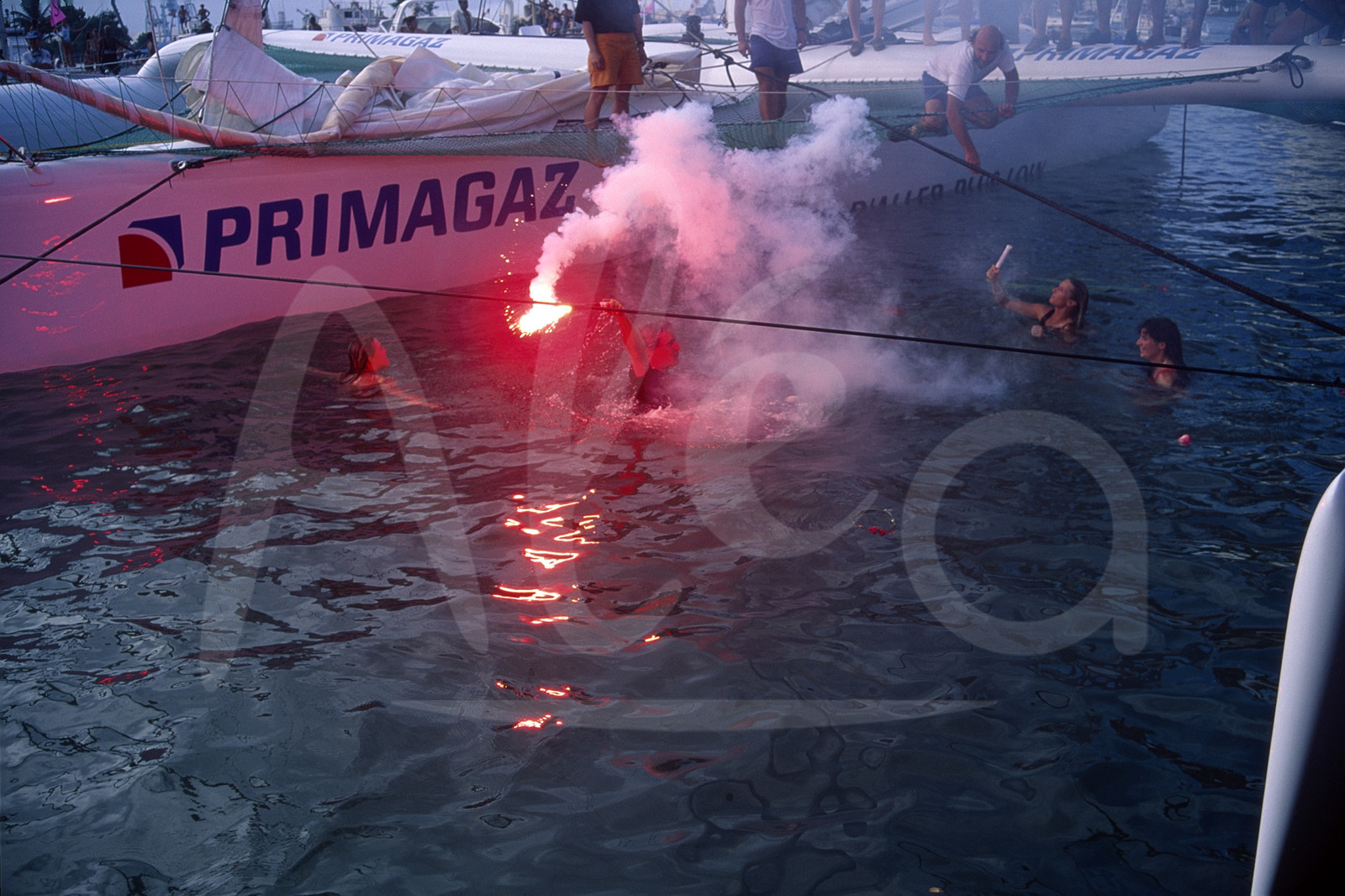 Description | Joie du Vainqueur, Skipper Laurent Bourgnon, trimaran Primagaz, à l'arrivée de la Route du Rhum, à Pointe A Pitre, Guadeloupe, le 20 Novembre 1994 - Photo Bernard Rubinstein / ALEA |