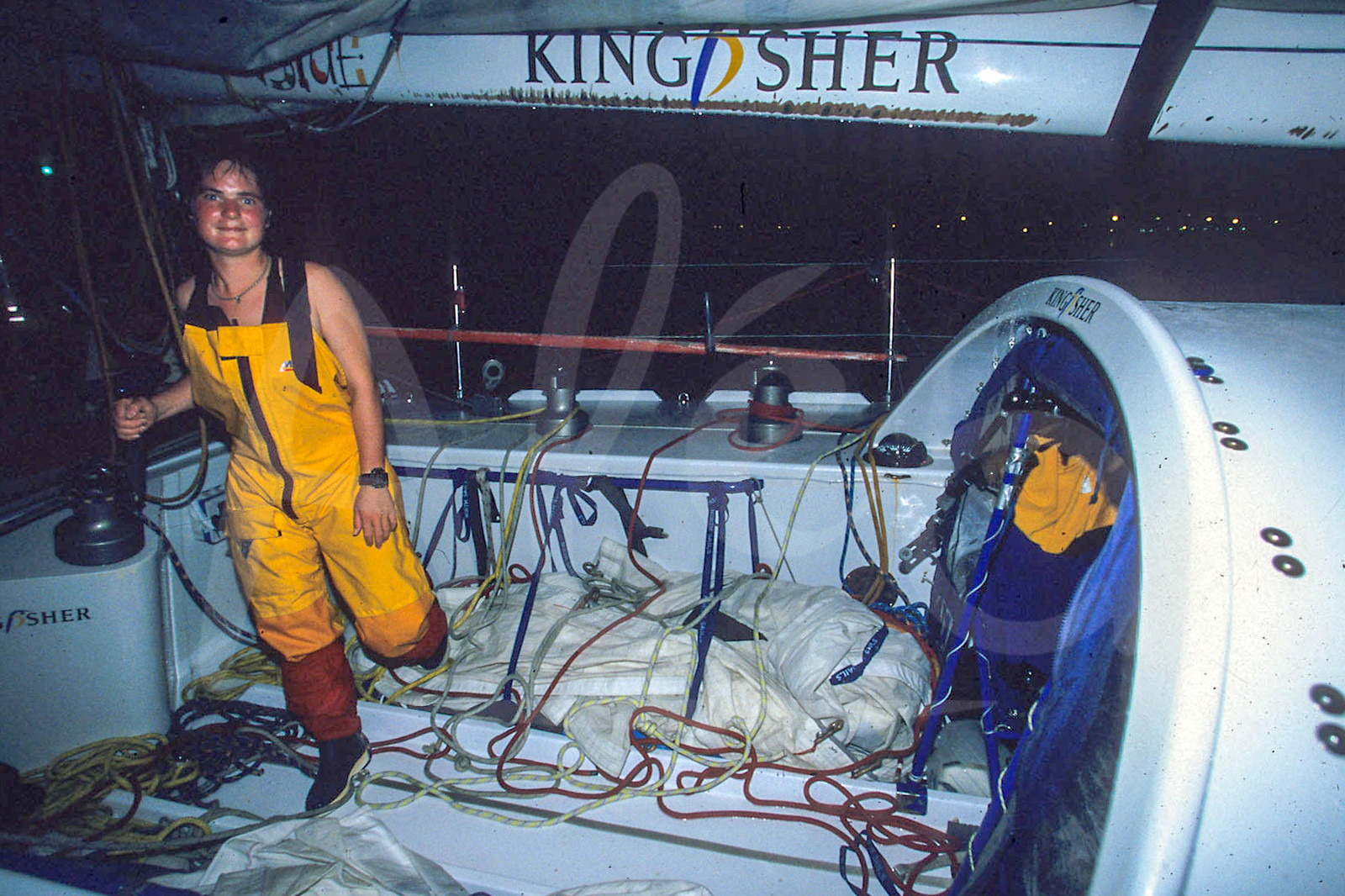 Description | Ellen MacArthur, skipper Kingfisher, vainqueur en catégorie 50 pieds à l'arrivée de la Route du Rhum 1998, à Pointe à Pitre, Guadeloupe, Novembre 1998, Photo : Jean-Marie Liot / Alea.###.Ellen MacArthur, skipper Kingfisher, winner in 50 feet ranking, during arrival la Route du Rhum 1998, in Pointe à Pitre, Guadeloupe, November 1998, Photo : Jean-Marie Liot / Alea |