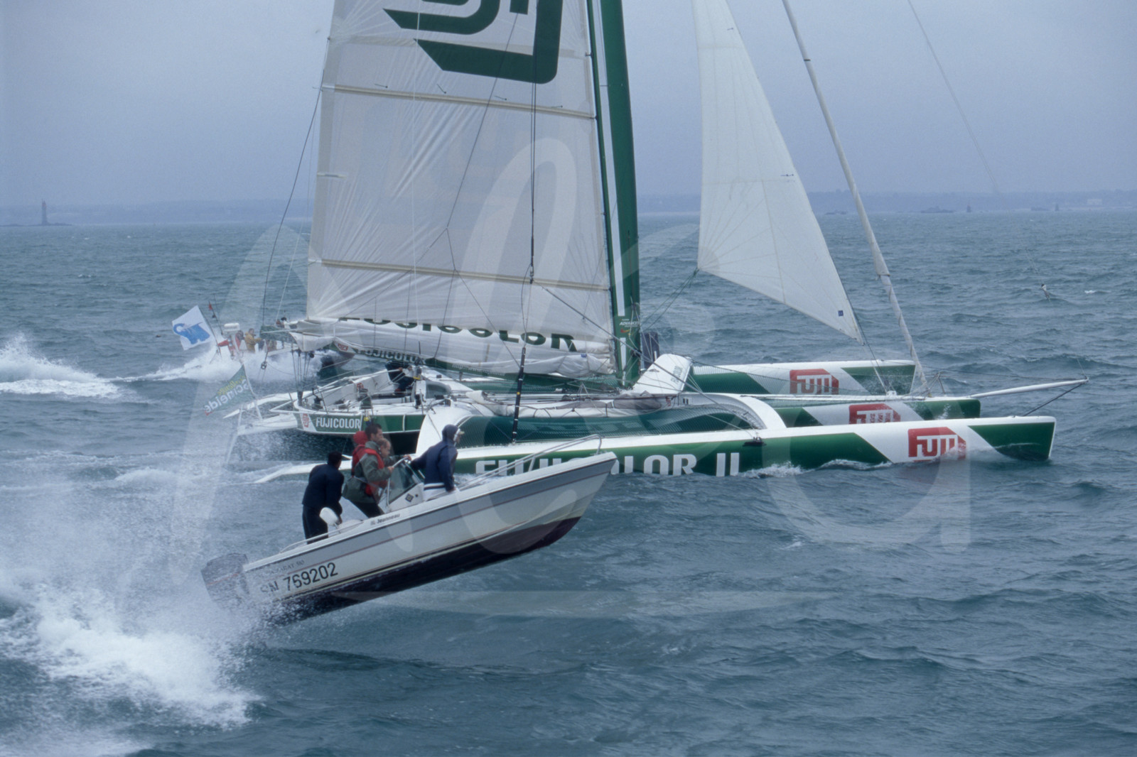 Description | Action du Skipper Loick Peyron, Fujicolor II, avec un motorboat sauteur à ses côtés, pendant le départ de la Route du Rhum, à St Malo, Bretagne, le 8 Novembre 1998 - Photo Bernard Rubinstein / ALEA |
