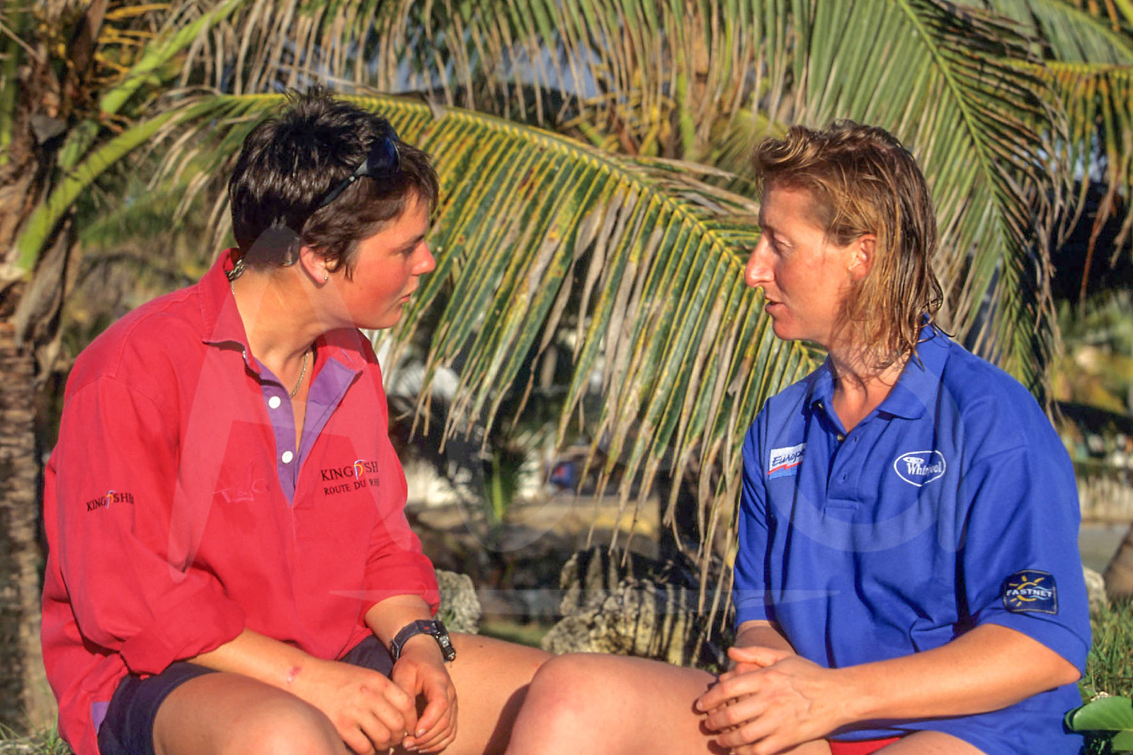 Description | Ellen Macarthur après sa victoire dans la Route du Rhum 1998, catégorie 50 pieds, à son hotel de Pointe à Pitre Guadeloupe, avec l'autre femme de la course, Catherine Chabaud, skipper IMOCA Whirlpool, Photo : Jean-Marie Liot / Alea.###.Ellen Macarthur after his victory of la Route du Rhum 1998, in 50 feet ranking, with the other woman of the race Catherine Chabaud skipper IMOCA Whirlpool, Photo : Jean-Marie Liot / Alea. |