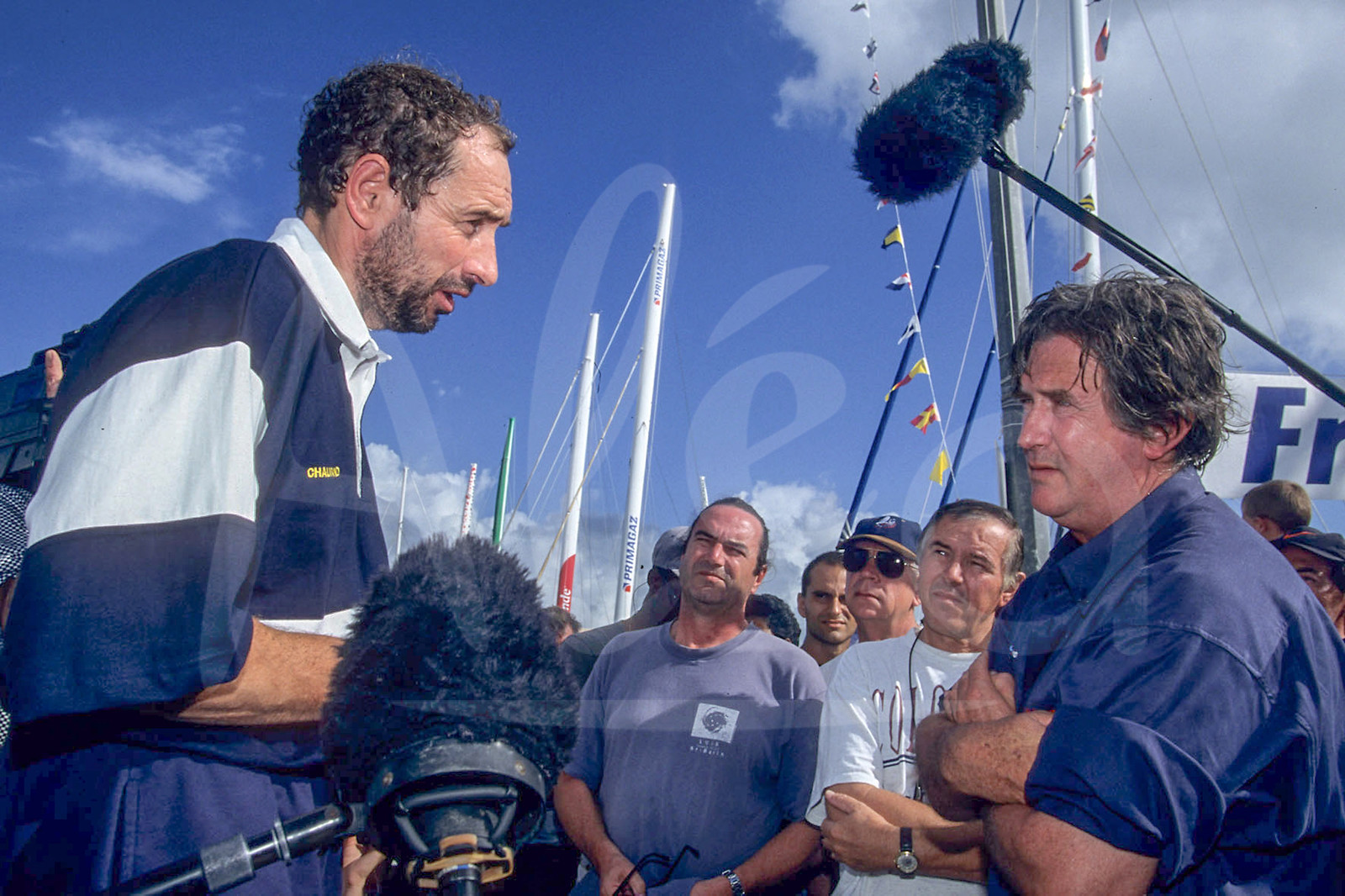 Description | Paul Vatine, skipper ORMA Chauss'Europ accueilli par Olivier de Kersauzon lors de l'arrivée de la Route du Rhum 1998, Pointe à Pitre, Guadeloupe, Photo : Jean-Marie Liot / Alea.###.Paul Vatine, skipper ORMA Chauss'Europ withOlivier de Kersauzon during arrival of la Route du Rhum 1998, Pointe à Pitre, Guadeloupe, Photo : Jean-Marie Liot / Alea |
