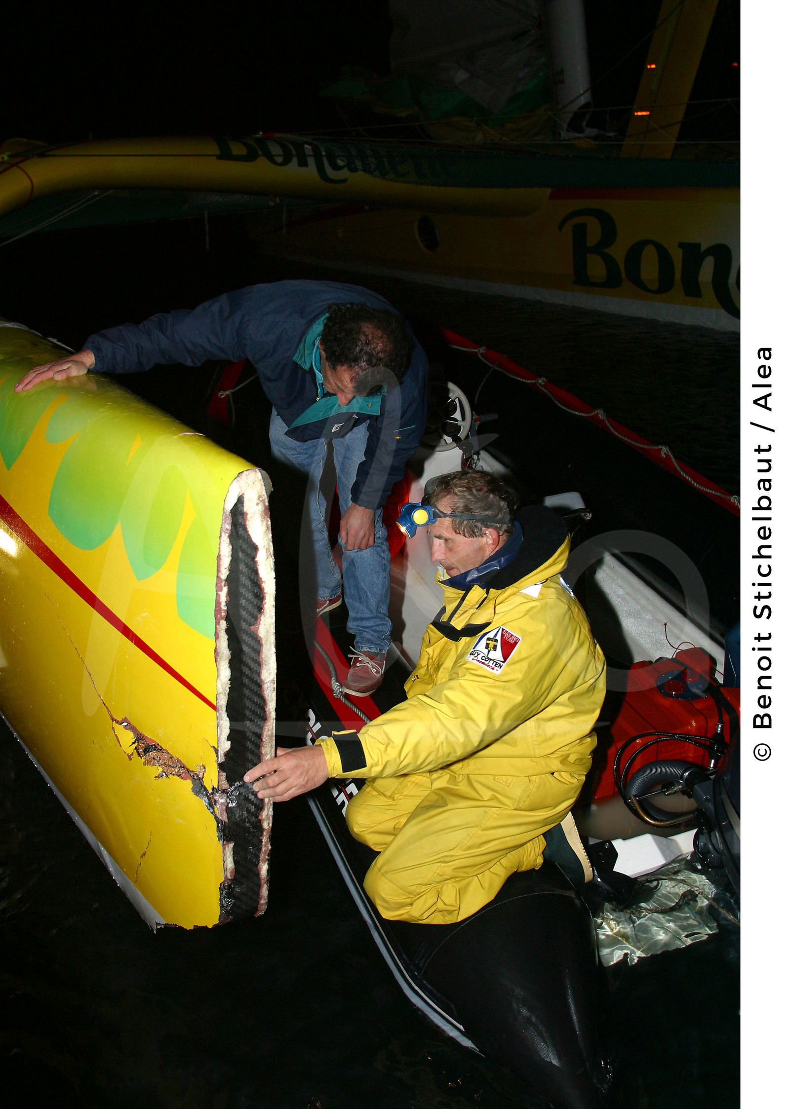 | Description | SAILING - ROUTE DU RHUM 2002 - CAMARET (FRA) - BONDUELLE PIT-STOP - MULTIHULLS 60' ORMA - 11/11/2002 - PHOTO : BENOIT STICHELBAUT / ALEA.BONDUELLE / SKIPPER : JEAN LE CAM (FRA) - AFTER COLLISION WITH GROUPAMA CAPSIZED - JACQUES CARAES (FRA) TECHNICAL MANAGER AND HUBERT DESJOYEAUX (FRA) THE SHIPBUIDER AND CDK SHIPYARD MANAGER NOTE THE DAMAGES TO THE HULL BOW |
