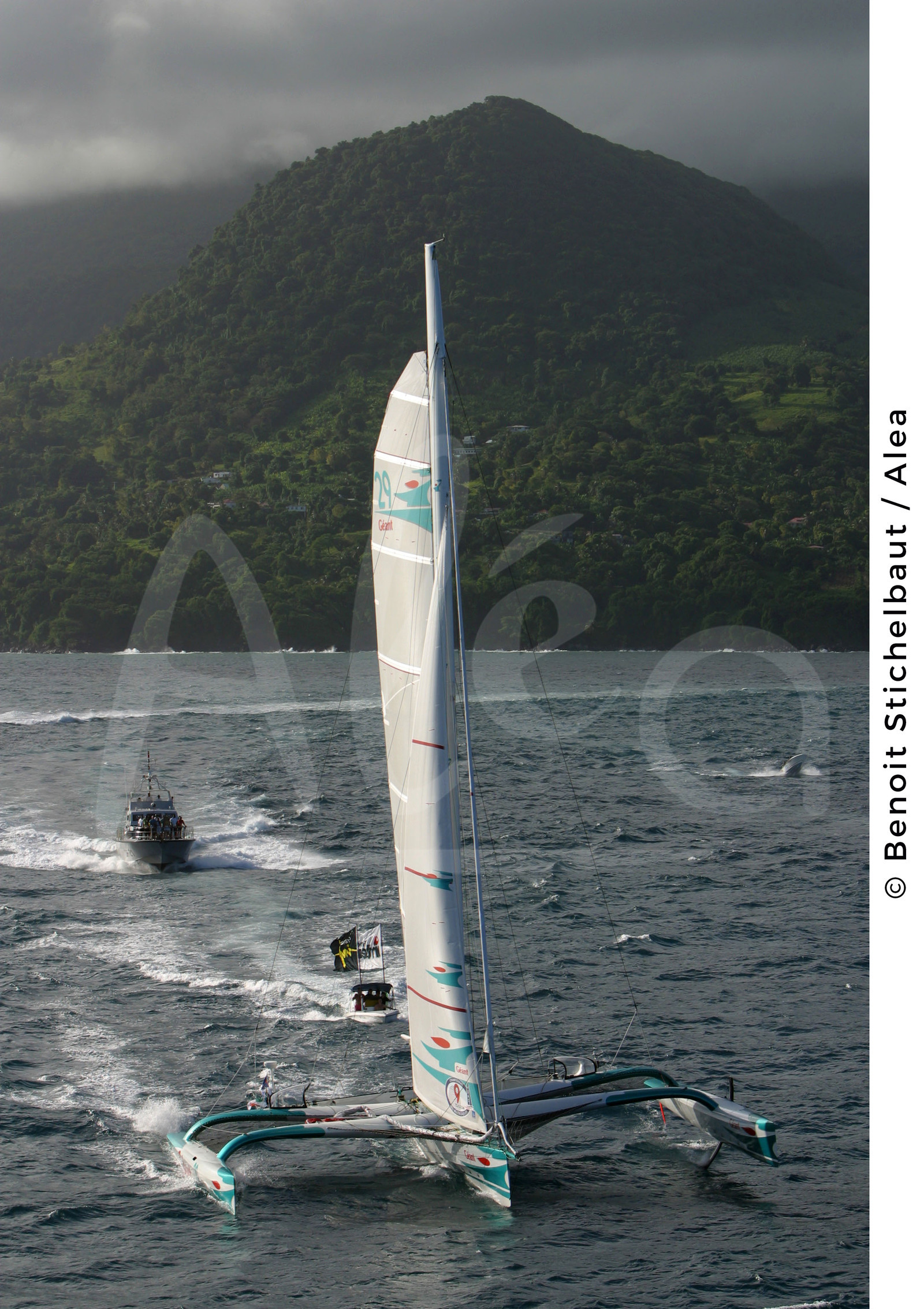 | Description | SAILING - ROUTE DU RHUM 2002 - FINISH POINTE A PITRE (FRA) - GUADELOUPE - MULTIHULLS 60' ORMA - 23/11/2002 - PHOTO : BENOIT STICHELBAUT / ALEA.GEANT / SKIPPER : MICHEL DESJOYEAUX (FRA) / WINNER MUTIHULLS 60'/ 13 DAYS 7 HOURS 53 MN 00 SECONDS - ON THE BACKGROUND GUADELOUPE ISLAND |