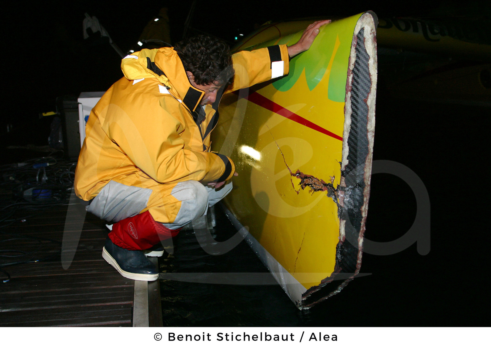 | Description | SAILING - ROUTE DU RHUM 2002 - CAMARET (FRA) - BONDUELLE PIT-STOP - MULTIHULLS 60' ORMA - 11/11/2002 - PHOTO : BENOIT STICHELBAUT / ALEA.BONDUELLE / SKIPPER : JEAN LE CAM (FRA) - AFTER COLLISION WITH GROUPAMA CAPSIZED - JEAN DISAPPOINTED NOTES THE DAMAGES TO THE HULL BOW |