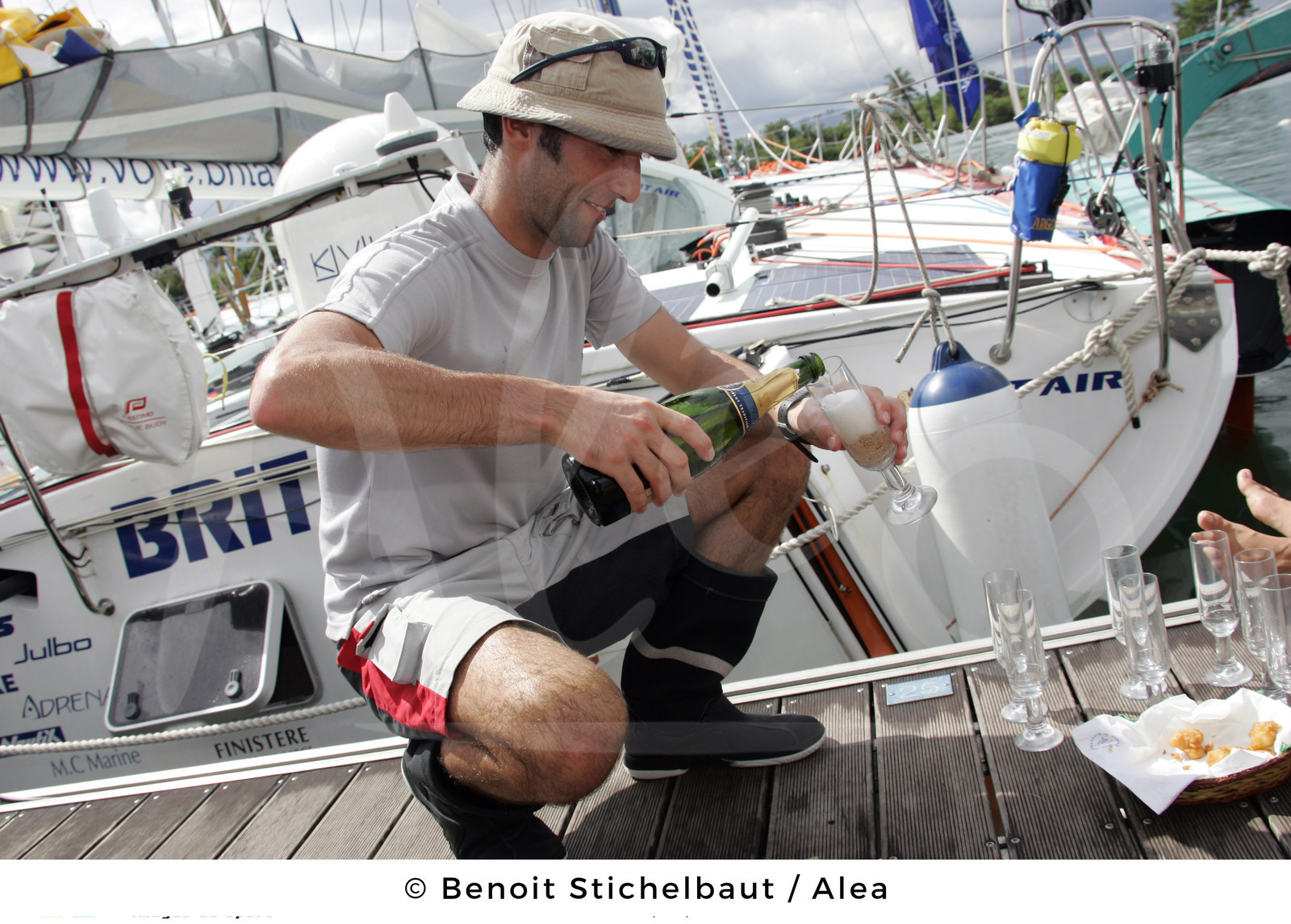 Description | SAILING - ROUTE DU RHUM LA BANQUE POSTALE 2006 - FINISH POINTE A PITRE (FRA) GUADELOUPE - 11/11/2006.PHOTO : BENOIT STICHELBAUT / ALEA / VIRBAC-PAPREC.IMOCA - BRIT AIR / SKIPPER: ARMEL LE CLEAC'H (FRA) / 4TH / CELEBRATING WITH CHAMPAGNE - LE CLEACH |